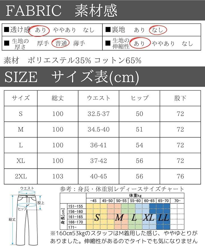 「素材」ポリエステル35% コットン65%「カラー」3カラー(ライトブルー、ブルー,ブラック)「サイズ(cm)」S ウエスト32.5-37/着丈100/股下72/ヒップ50 M ウエスト34.5-40/着丈100/股下72/ヒップ51 L ウエスト36-41/着丈100/股下72/ヒップ54 XL ウエスト37-42/着丈100/股下72/ヒップ56 2XL ウエスト40-45/着丈103/股下76/ヒップ56
