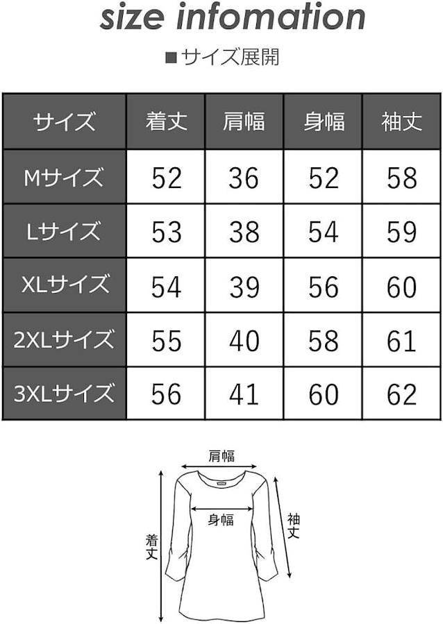「サイズ」「M」着丈52 / 肩幅36 / 身幅52 / 袖丈58・「L」着丈53 / 肩幅38 / 身幅54 / 袖丈59 ・「XL」着丈54 / 肩幅39 / 身幅56 / 袖丈60 ・「2XL」着丈55 / 肩幅40 / 身幅58 / 袖丈61 ・「3XL」着丈56 / 肩幅41 / 身幅60 / 袖丈62 *サイズに多少の誤差がある場合がございます。