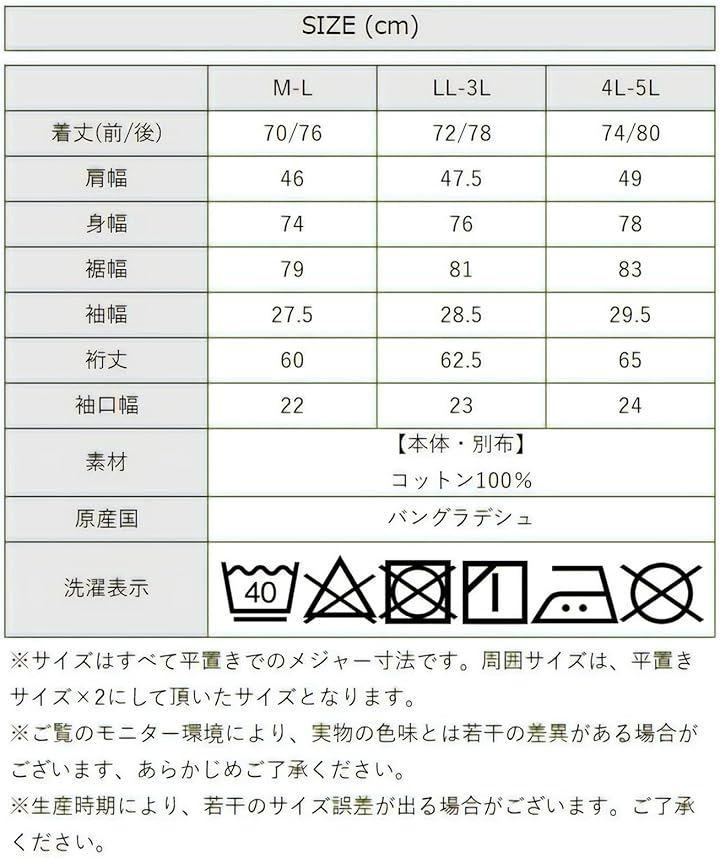 [M-Lサイズ]着丈70/76cm、肩幅46cm、身幅74cm、裄丈60cm、袖幅27.5cm、袖口幅22cm、裾幅79cm [LL-3Lサイズ]着丈72/78cm、肩幅47.5cm、身幅76cm、裄丈62.5cm、袖幅28.5cm、袖口幅23cm、裾幅81cm [4L-5Lサイズ]着丈74/80cm、肩幅49cm、身幅78cm、裄丈65cm、袖幅29.5cm、袖口幅24cm、裾幅83cm