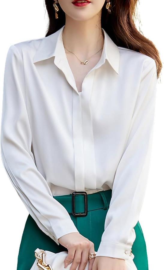 動くたびにやわらかく光を反射し、女性らしさを際立たせるサテン調素材を使用したシャツです。