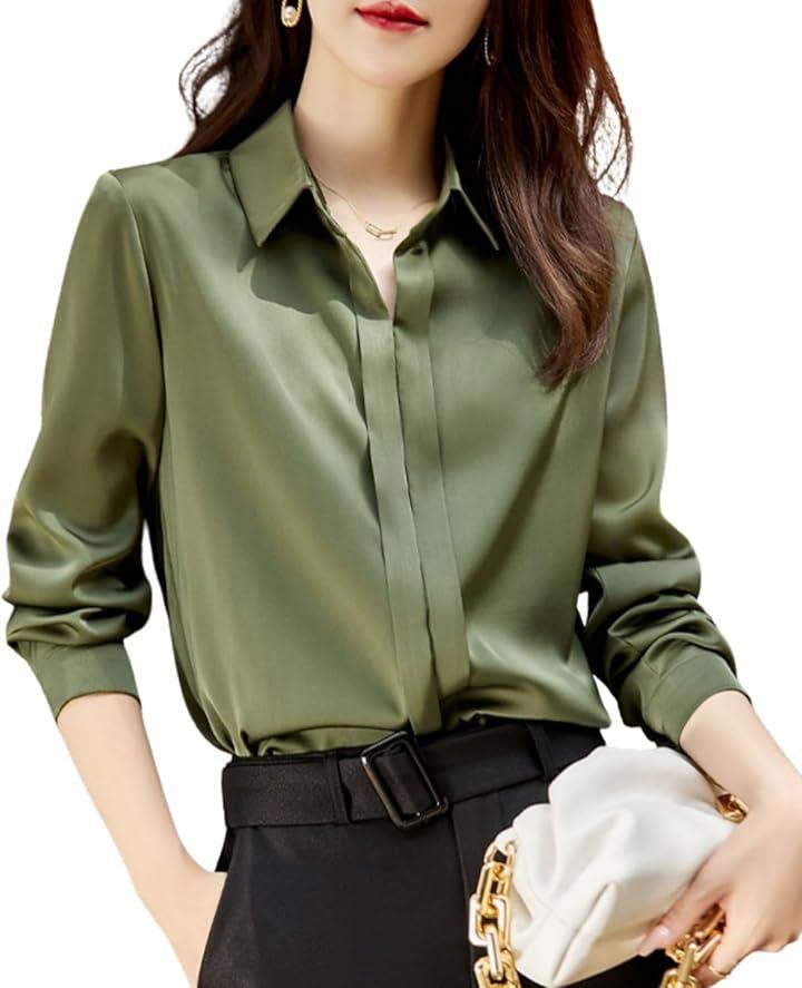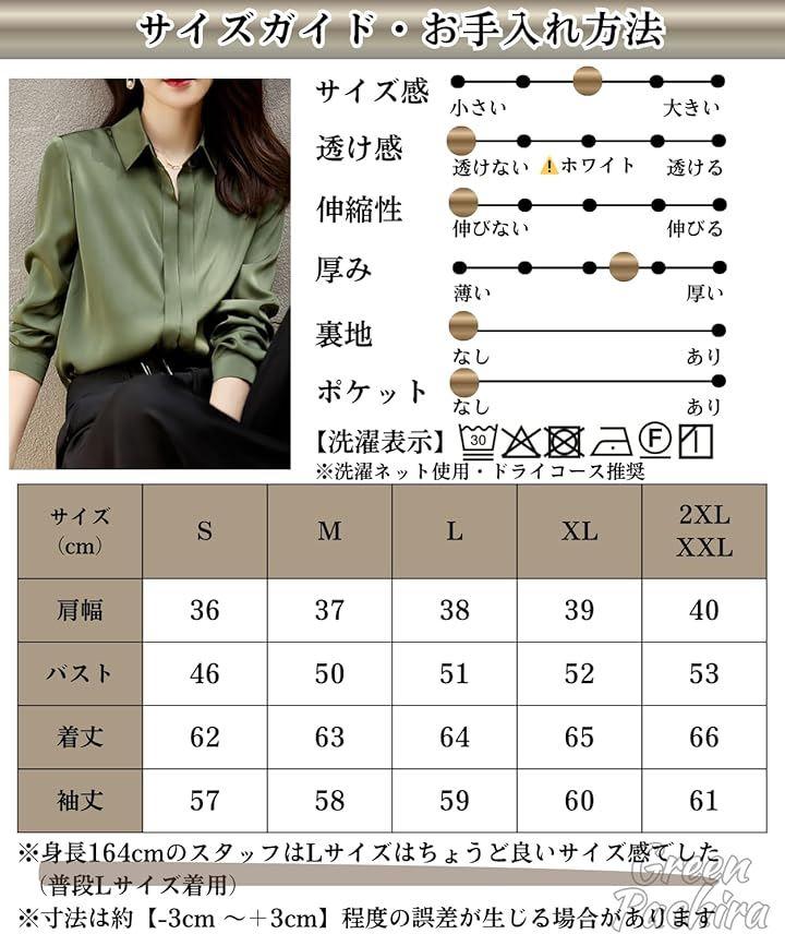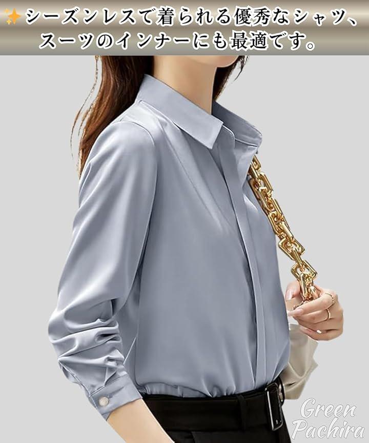 動くたびにやわらかく光を反射し、女性らしさを際立たせるサテン調素材を使用したシャツです。