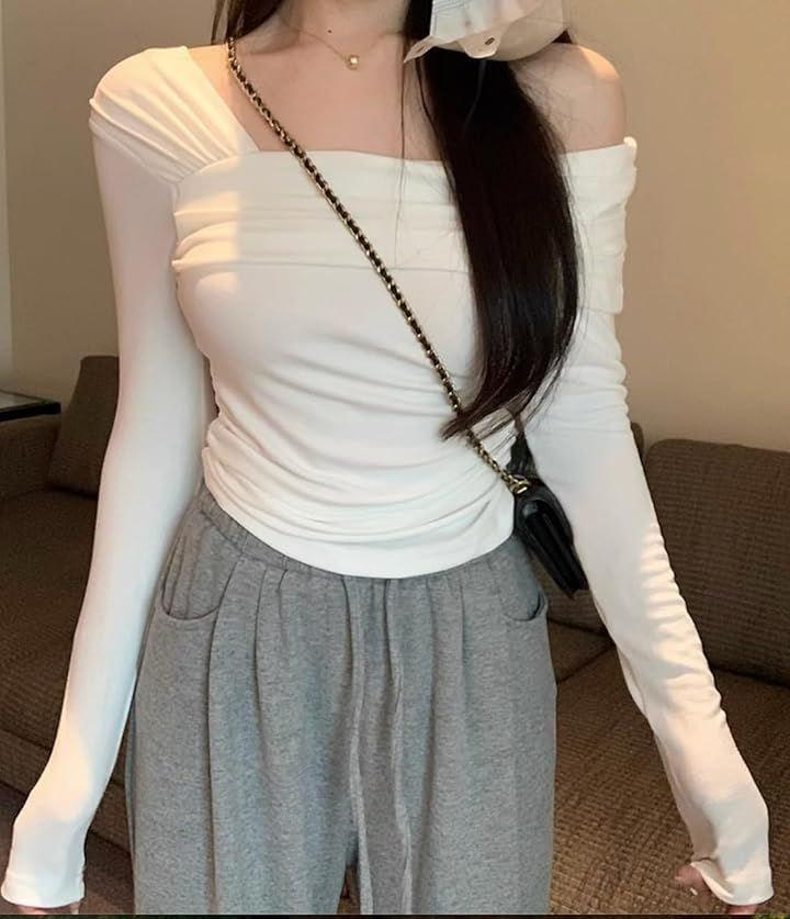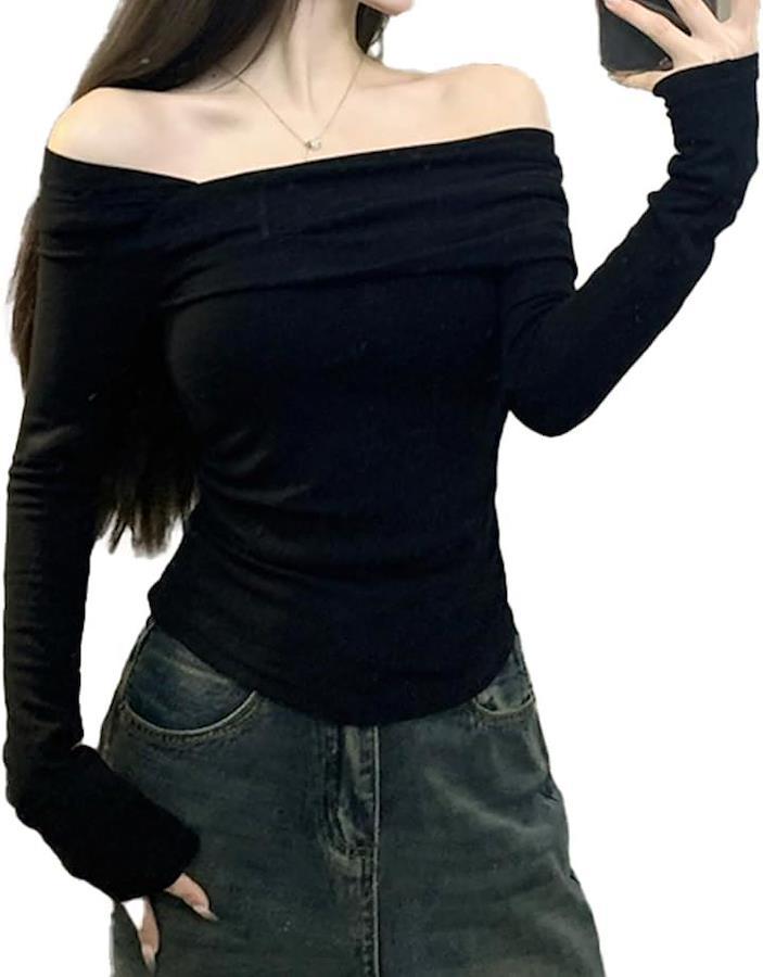 肩を大胆に魅せるオフショルダーと、長袖のシルエットが大人の魅力をプラス。