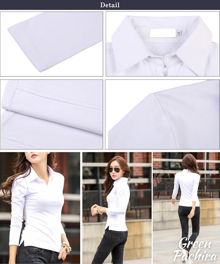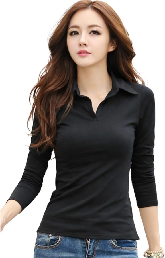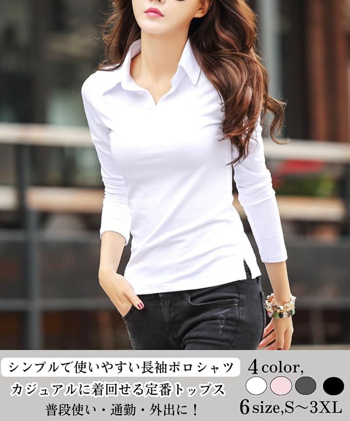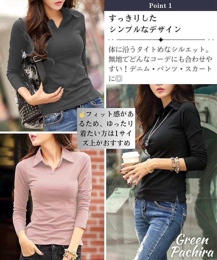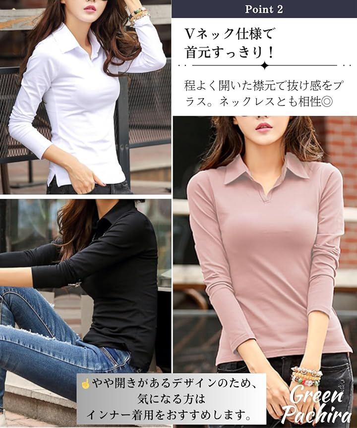 「普段使いしやすいシンプルデザイン」半袖&長袖の襟付きVネックデザインのレディーストップスです。