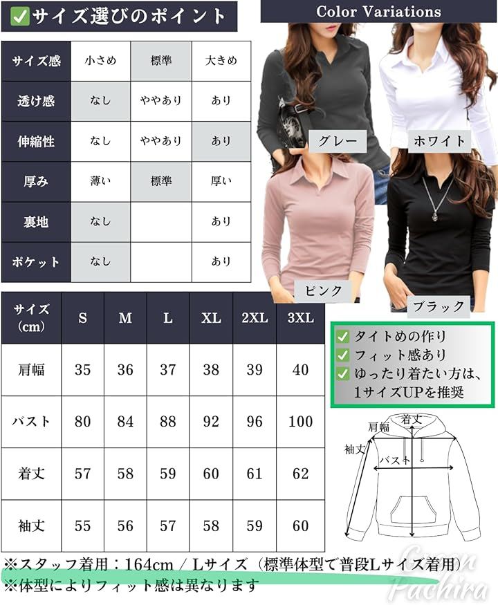 サイズ:肩幅/バスト/着丈/袖 半袖 Sサイズ:37/80/57/16.5 半袖Mサイズ:38/84/58/17 半袖Lサイズ:39/88/59/17.5 半袖2L(XL)サイズ:40/92/60/18 半袖3L(2XL)サイズ:41/96/61/19 半袖4L(3XL)サイズ:42/100/62/20 長袖Sサイズ:35/80/57/55 長袖Mサイズ:36/84/58/56 長袖Lサイズ:37/88/59/57 長袖XLサイズ:38/92/60/58 長袖2XLサイズ:39/96/61/59長袖 3XLサイズ:40/100/62/60 *平置き採寸のため±3cm程度の誤差が生じる場合がございます。