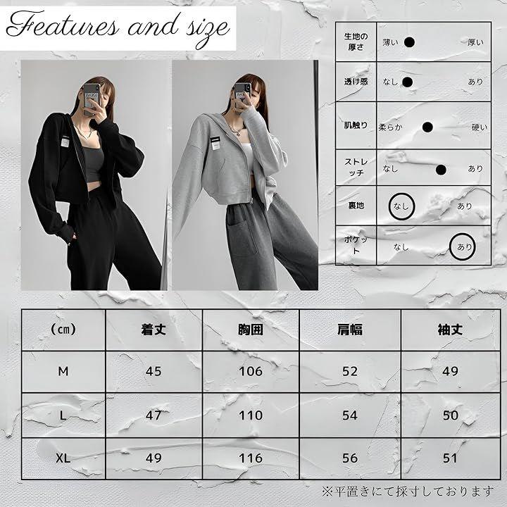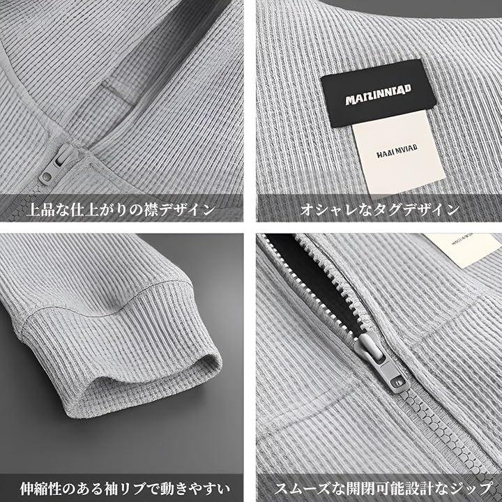 デザイン: ショート丈のジップアップパーカーで、ドロップショルダーのゆったりとしたシルエットがトレンド感を演出。素材: 柔らかなワッフル素材を使用し、軽量で通気性に優れた着心地を実現。