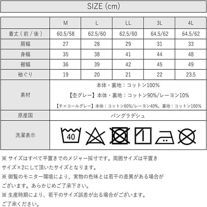 「サイズ」[Mサイズ]着丈(前/後):60.5/58cm、肩幅:27cm、身幅:35cm、裾幅:36cm、袖ぐり:19cm[Lサイズ]着丈(前/後):62.5/60cm、肩幅:28cm、身幅:38cm、裾幅:39cm、袖ぐり:20cm[LLサイズ]着丈(前/後):62.5/60cm、肩幅:29cm、身幅:41cm、裾幅:42cm、袖ぐり:21cm[3Lサイズ]着丈(前/後):64.5/62cm、肩幅:31cm、身幅:44cm、裾幅:45cm、袖ぐり:22cm[4Lサイズ]着丈(前/後):64.5/62cm、肩幅:33cm、身幅:48cm、裾幅:49cm、袖ぐり:23.5cm