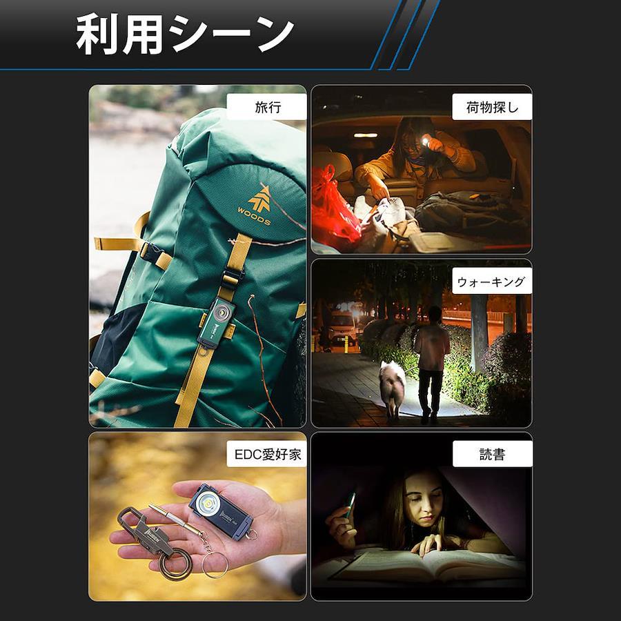 ●OSRAM P9 LED ×1搭載●明るさ:最大500ルーメン●サイズ:58.5×27×9.2mm●重さ:28g●モード:Turbo/High/Med/Low/Moon明るさ最大500ルーメンのキーホルダーライトType-C充電式 最大連続使用時間:約70時間最大照射距離46メートル 175°超広角照射1)点灯・消灯Wボタンスイッチを長押し→点灯。 Wボタンスイッチを押す→消灯。明るさモード記憶機能搭載。ターボモードは記憶されません。2)モード切替点灯時、Wボタンスイッチを長押しするとMoon→Low→Med→Highと切り替わります。指を離すと明るさモードが固定されます。3)クイックターボモード点灯及び消灯時、Wボタンスイッチを連続2回押し→Turboモードで点灯。Wボタンスイッチを押す→消灯。Wボタンスイッチを長押し→モード切替バックホールドクリップにより脱着が簡単