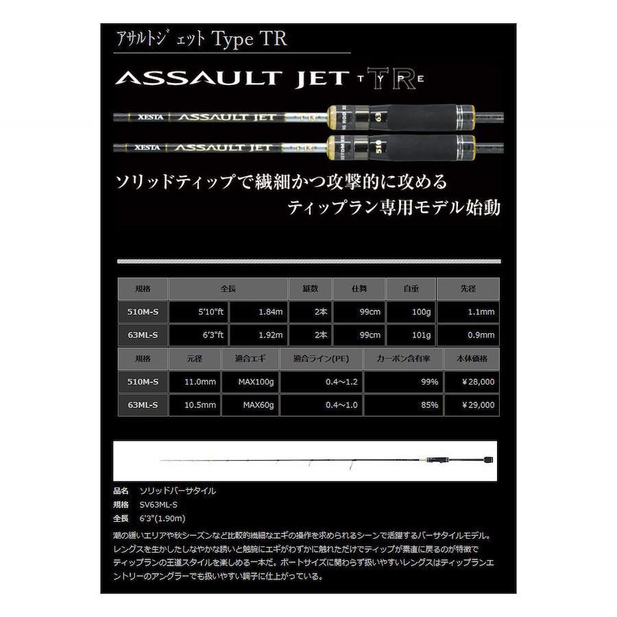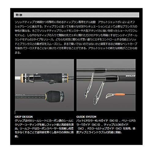 ソリッドティップで繊細かつ攻撃的に攻めるティップラン専用モデル始動アサルトジェットがいよいよオフショアシーンに進出する。ティップランと言っても様々な状況やシチュエーションによって必要なブランクスの特性が異なる。そこでソリッドティップでレッドモンスターや大型アオリイカに狙いを絞ったショートパワフルモデルと、しなやかなティップの入りで触腕の先でエギに触れただけのアタリも明確にするセンシティブオールランドモデルの2タイプをリリース。どちらも状況に関わらず思い通りにエギをコントロールする性能とソリッドとブランクスとの繋ぎ目をスムーズにし、まるで繋いでないのではないかと錯覚するほど綺麗なベントカーブを描きパワーロスすることなく掛けたイカを寄せることができる。アサルトジェットの新たな挑戦がここから始まる。SV63ML-S ソリッドバーサタイル潮の緩いエリアや秋シーズンなど比較的繊細なエギの操作を求められるシーンで活躍するバーサタイルモデル。レングスを生かしたしなやかな誘いと触腕にエギがわずかに触れただけでティップが素直に戻るのが特徴でティップランの王道スタイルを楽しめる一本だ。ボートサイズに関わらず扱いやすいレングスはティップランエントリーのアングラーでも扱いやすい調子に仕上がっている。