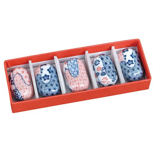 ころんとしたお豆のような可愛い箸置きのセットです。ちょっと箸を休め、食事や団欒のひとときをゆったり過ごしていただきたい、そんな想いからのシリーズ名です。☆場所をとらず、手軽に食卓の趣を変えられるアイテムです。☆中央部が豆のように少し凹んでいるので、箸のすわりもgoodです。☆朱の箱にセットしました。お祝いやギフトにも最適です。