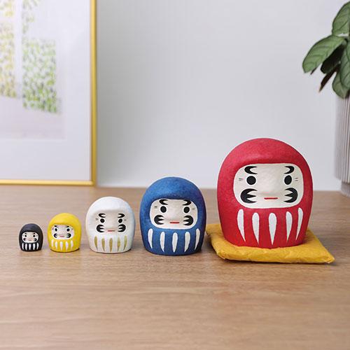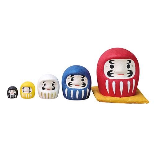 張り子のもつ、独特のぬくもり感が魅力。伝統的なだるまさんをユーモラスに彩りました。張り子は、魔除け、無病息災、安産、子供の成長を願うためにつくられました。人のかたちや動物のかたちに似せたものは魂が宿るとされ、厄払いのために生まれたとされます。ロシアのマトリョーシカのように入れ子になった、楽しい張り子です。お部屋のインテリアに、玄関先にぴったりです。座布団と一番大きなだるまはマグネットでくっつくようになっています。ひとつひとつ心を込めて作った張り子です。