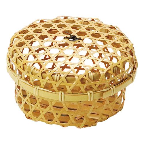 白竹(皮付)を使用した、六ツ目編みの蓋付丸篭です。耐久性がある白竹篭に蓋を付け、風情ある料理篭に仕立てました。☆国産手造り商品です。白竹篭の蓋付きは人気があります。