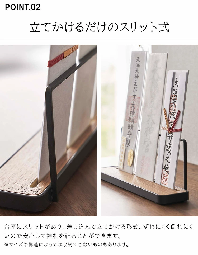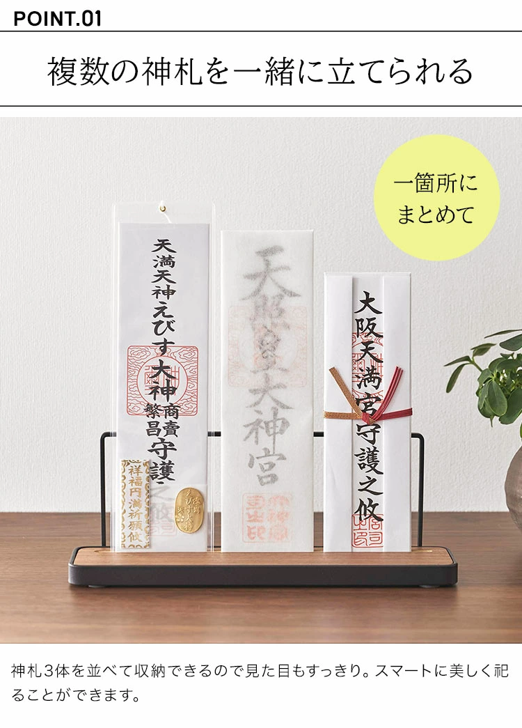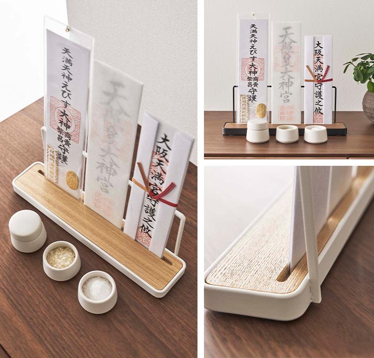 【お札スタンド】神棚がないご家庭でも神札を祀ることができる神札スタンド。複数の神札をお祀りできるワイドタイプです。台座のスリットに差し込む構造なのでずれや転倒を防ぎます。シンプルでモダンなデザインなのでインテリアにも溶け込んですっきり置くことができます。