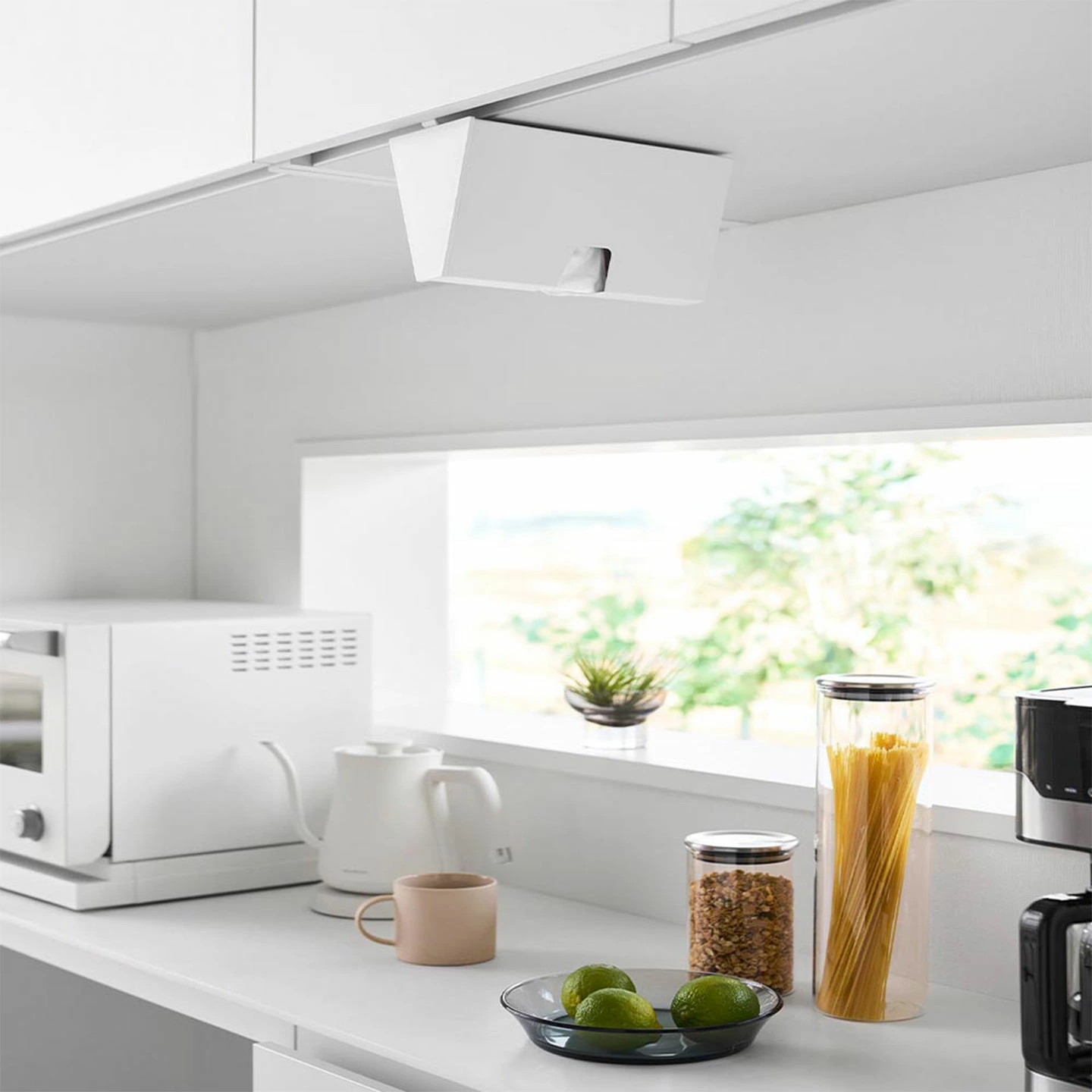 【戸棚下プラスチックバッグケース】下からサッと取り出せるプラスチックバッグケースです。吊り下げ戸棚に差し込むだけで簡単に設置でき、中身を隠してスッキリ収納!