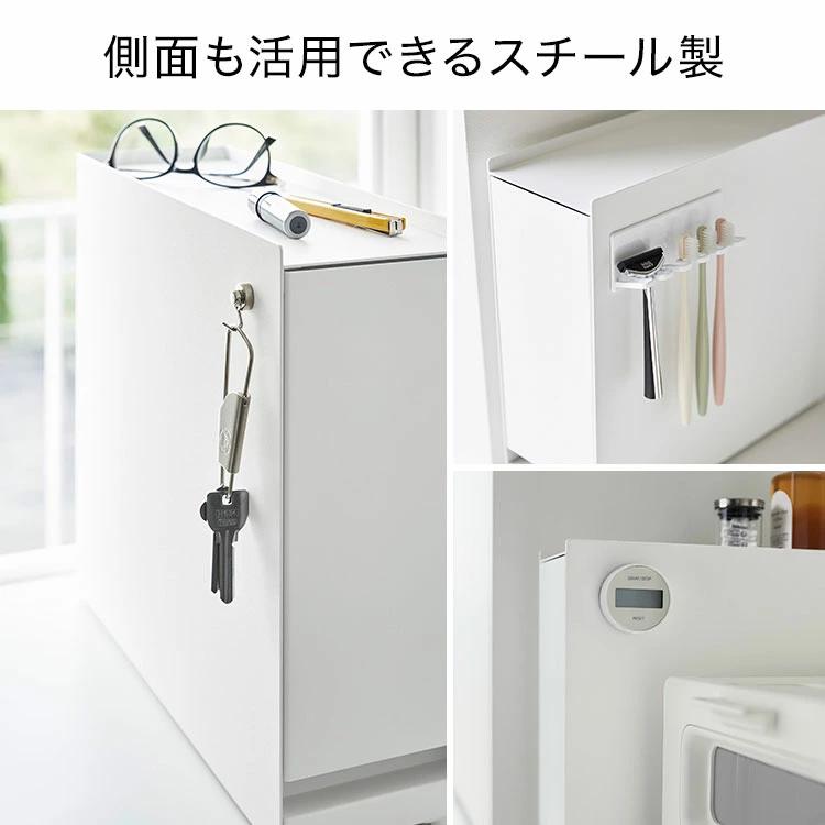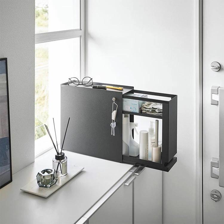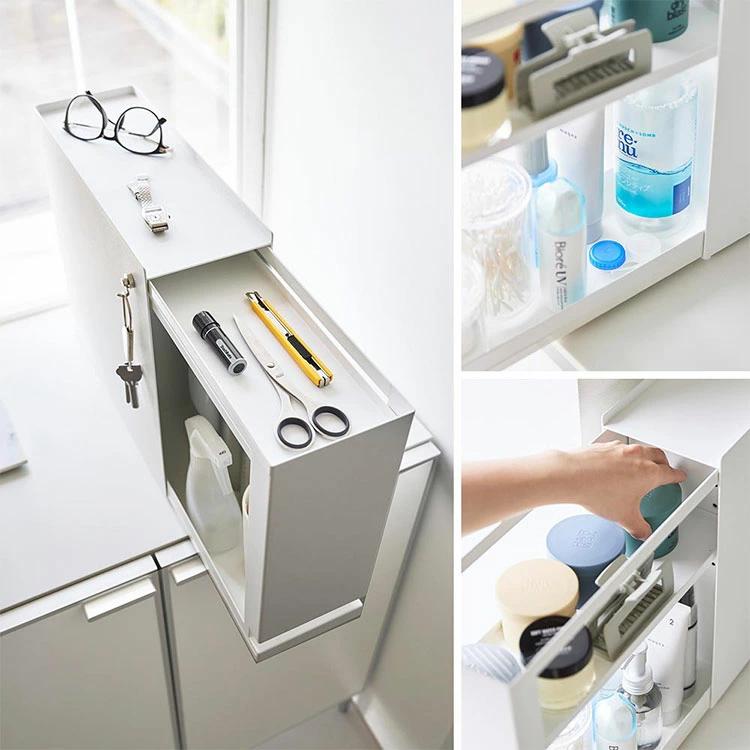 【隠せる引き出し収納】玄関、洗面所、キッチンなど場所を選ばず使える隠せる引き出し収納。棚板は2.5cmピッチで高さ調節が可能です。玄関では衣類クリーナーや消臭スプレー、鍵などを一括収納。ヘアースプレーやワックス、歯ブラシ類の収納として洗面所への設置や、キッチンでカップボードに設置し調味料収納としてもおすすめです。スチール製なので側面にマグネットが使えます。