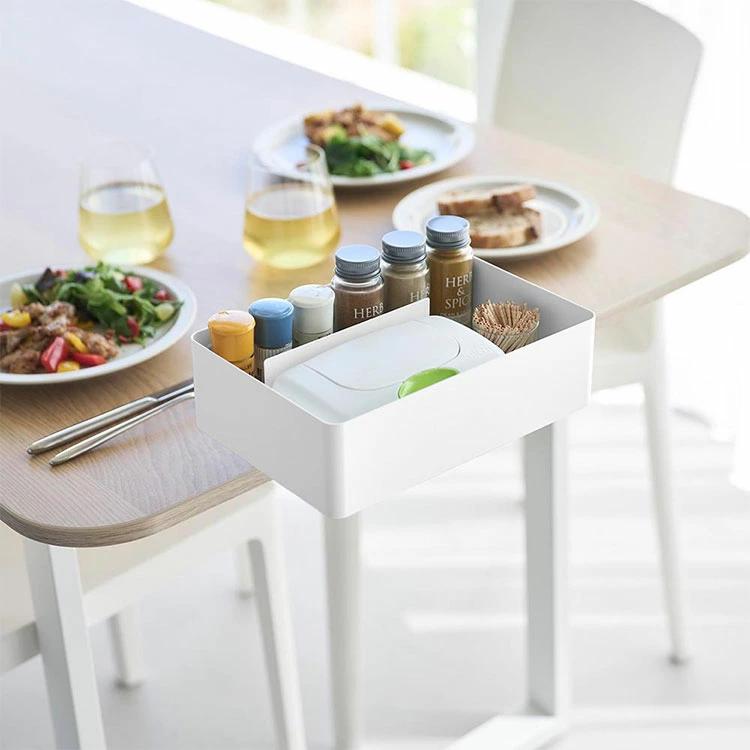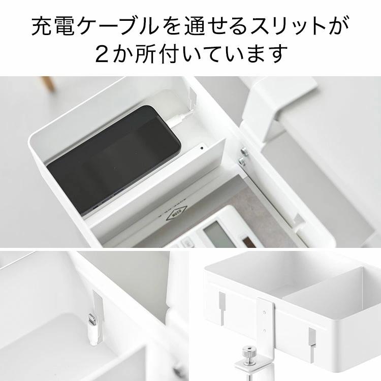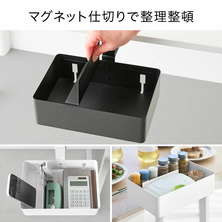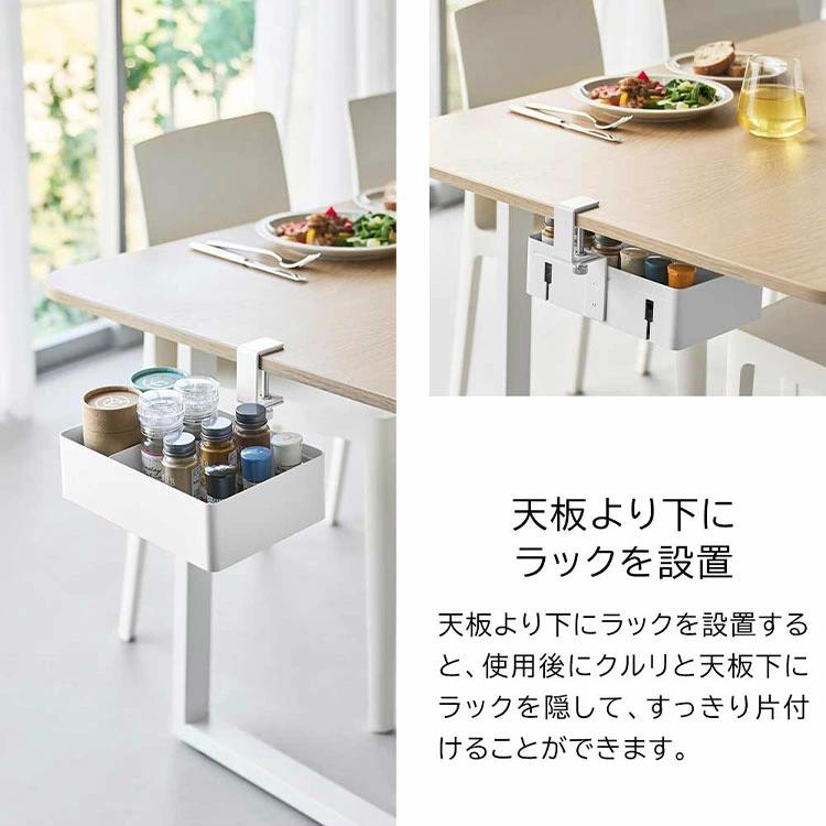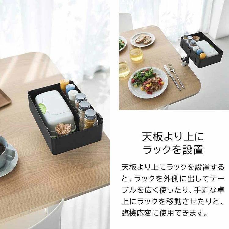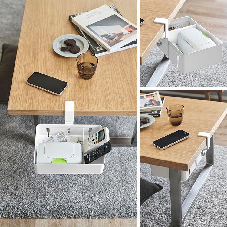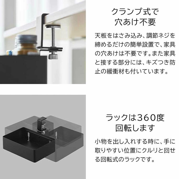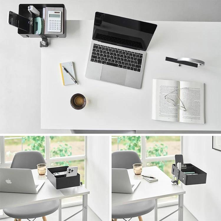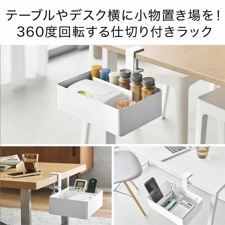 【テーブル横回転収納ラック】手に取りやすいテーブル横に取り付けできる、360度回転式の収納ラックです。設置場所や用途に合わせて、デスク下側・上側の2通りの取り付けが可能。クランプ式の固定構造でしっかりと設置できます。必要なときにサッと回転させて取り出せ、使わないときはすっきり収納。テーブル上を広く使えて、スペースの有効活用に!調味料やリモコン、小物類をまとめて収納でき、スマートフォンを収納しながら充電することも可能です。充電しないときは、ケーブルの先端を引っ掛けておくことができます。マグネット付きの仕切りは、収納物に合わせて自由に位置を調整できます。