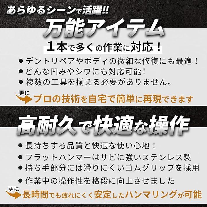 「商品概要」板金工具としてデントリペアの必需品。 この板金ハンマーは、車のボディの凹みやシワを精密に修正するための専門ハンドツールです。