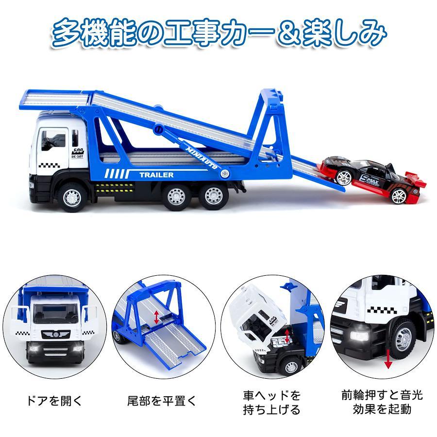 【建設車両セット新登場】新型の収納車おもちゃです。LEDライトとクールな音がついて、男の子だけでなく、女の子も楽しめます。リアルに再現された作業車で、本物のエンジニアリングシーンを復元することでお子様の認知を育てます。工事現場のごっこ遊びをしているうちに、お子様は頭中に場面を想像しながら、現場作業を真似します。6歳以上の子供に適しています。 【大きいトラックおもちゃ】トラックは上下2層構造で、上部分を斜めにして、載せていたレースカーを滑り台の如く勢いよく走らせる、みたいな遊び方も可能。作業車両セットと一緒、いつまでもどこまでも誰でも簡単に遊べます。楽しく創造力を育てるおもちゃです。 【プルバックカー】電池が車の中に付属して、大型自動車運搬車を押しながら後ろに引けてから放せるだけで、前に進みます。頑丈な合金を採用している車おもちゃで、高品質の材料を採用し、耐久性に優れています。小さな手に適した完璧なサイズです。セット内容:キャリアカー x1、黄色のミニカーx1、緑色のミニカーx1。 【遊びから学び】作業車両は友達もしくは家族一緒遊べます。お子様はその中に施工車両を置いて、起動できます。遊びの中で、手先の器用さ、集中力、自信など発達させ、遊びうちに想像力をたくさん膨らませ、指先を使って遊ぶことで脳にいい刺激を与える玩具です。 【魅力的なプレゼント】子供たちの誕生日、クリスマス、パーティーの完璧なプレゼントです。彼らは数時間のゲーム時間を楽しみ、友人と楽しみを共有し、ゲームで知識を得ることができます。屋内および屋外のゲームにも適しています。誕生日、パーティー、子供の日、クリスマス、ハロウィーン、感謝祭、お正月に最適なギフトです。