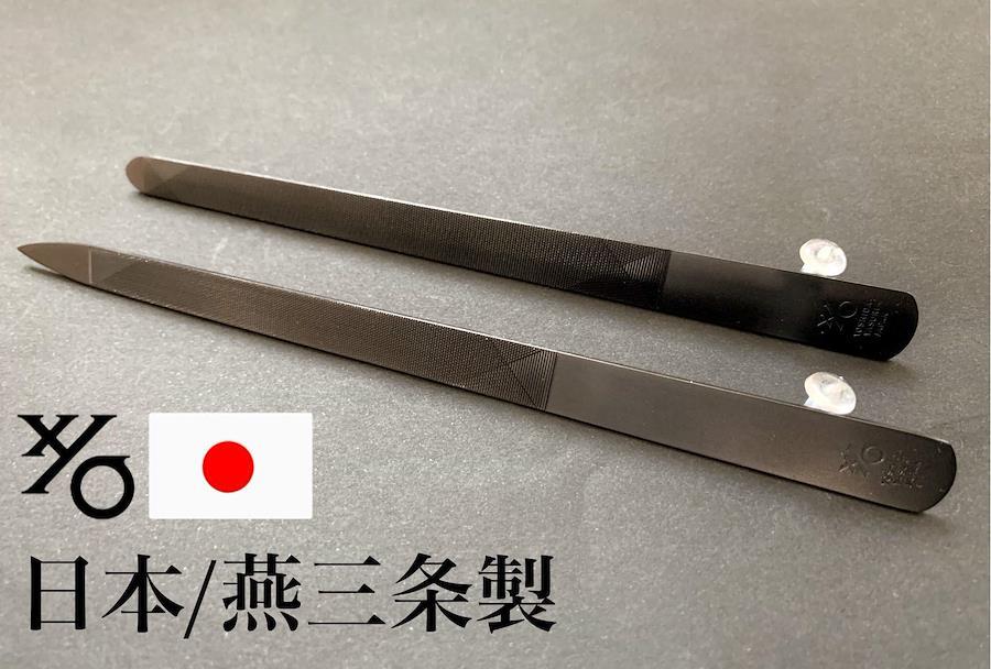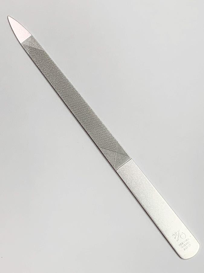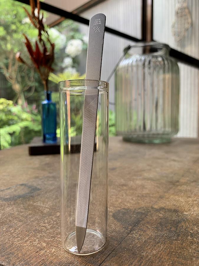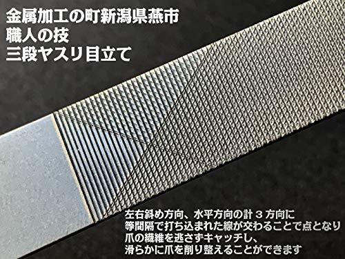 たがねは目を立てるごとに磨耗していくので、その都度たがねを研磨し直し、調整を繰り返します。 たがねが水平に研げていなかったり、目立て機の強弱のバランスが狂うと、ヤスリ目は均等にできあがりません。 職人は目、耳、目立て機の振動、ヤスリ目の触感を頼りに、一本一本作業を行います。 その3段が交差することで点が生まれ、その点が爪の細かな繊維をしっかりとキャッチします。 爪が逃げずにヤスリ面に沿うことで、負担をかけずに爪を滑らかに削ることが出来るのです。 等間隔に同じ深さに整然と打ち込まれたヤスリ目は、熟練の職人でしか成しえない技の粋です。 見た目も美しく、使い心地も抜群です。 ヤスリの形は2タイプ。 先尖りのタイプは吉田ヤスリ製作所に伝わるクラシックな形で、 先端を使用して軽度の巻き爪治しや、甘皮の処理に向いています。 もうひとつのラウンドタイプは、 お子様やご高齢の方にも安心してお使いいただけるよう先端を丸く仕上げました。 カラーは、マットシルバーとマットブラックの2色。 ブラックは酸化発色という技法を用い、ステンレス素材そのものを発色させています。 また、ステンレスは錆にも強く水洗いも可能なので衛生的にご使用いただけます。【重要】メーカーによる商品リニューアルに伴いパッケージ(内容量も含む)変更が行われた場合、新パッケージでお届け致します事ご了承願います。
