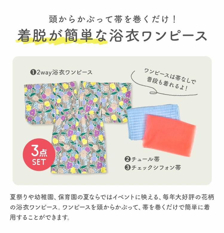 【レイヤード浴衣ワンピース Stripe&Flower】毎年大人気!着脱簡単なocean&groundのワンピース浴衣が今年も2柄登場。帯はシフォンとチュールの2枚重ねでふわっとした可愛いデザインが女の子らしさを倍増です。ワンピースを頭からかぶって、帯を巻くだけで簡単に着用することができます。夏祭りや幼稚園、保育園の夏ならではイベントに映えること間違いなしです♪