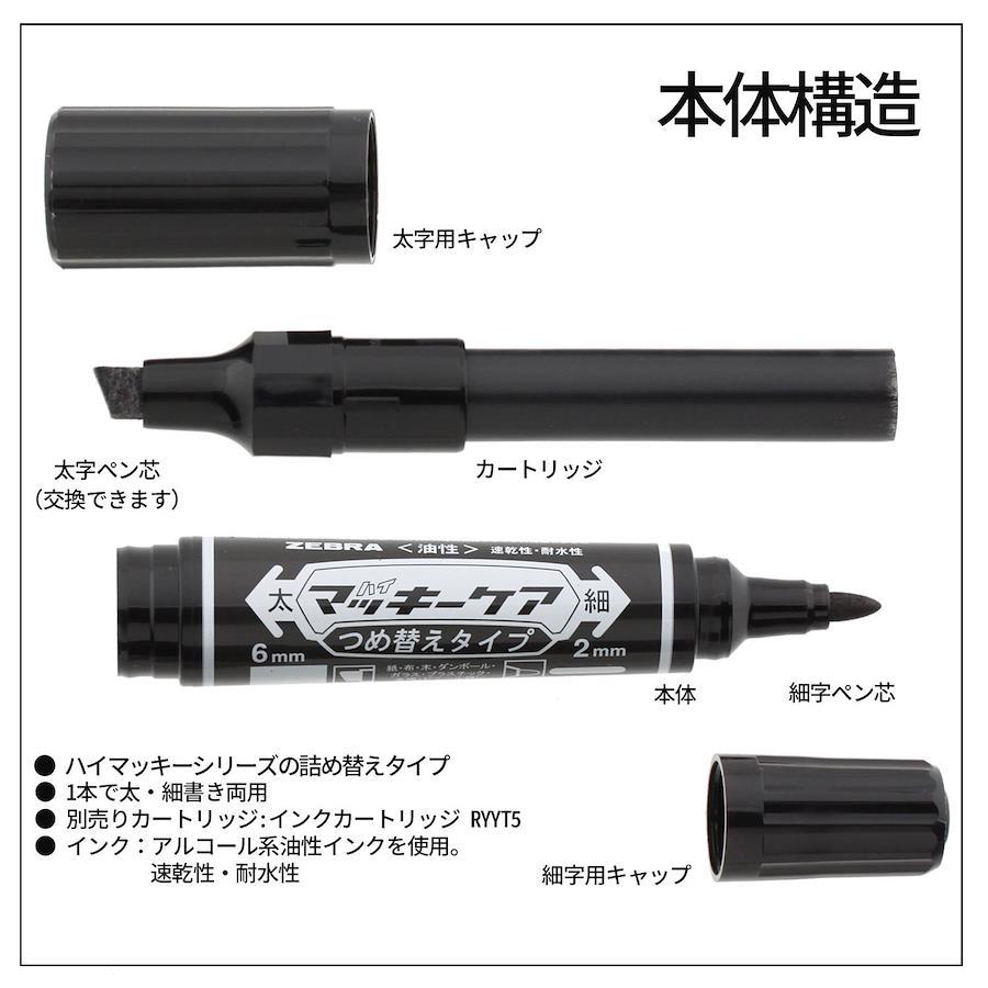インクカートリッジが交換可能な油性マーカー「マッキーケア」。経済的な油性マーカーです。一本で細字(線幅1.5~2.0mm)と太字(線幅6.0mm)の両書きタイプ。油性アルコール系インク使用で、紙、布、木、ダンボール、金属、ガラス、プラスチック等幅広くご使用できます。