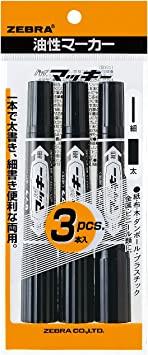 1本で太細両用が使える便利な油性マーカー。黒の3本入セット。速乾性・耐水性で、紙・布・木・ダンボール・ガラス・プラスチック・金属・ビニール類などに幅広く利用できる。(浮輪等の軟質塩化ビニール製品には適しません。)