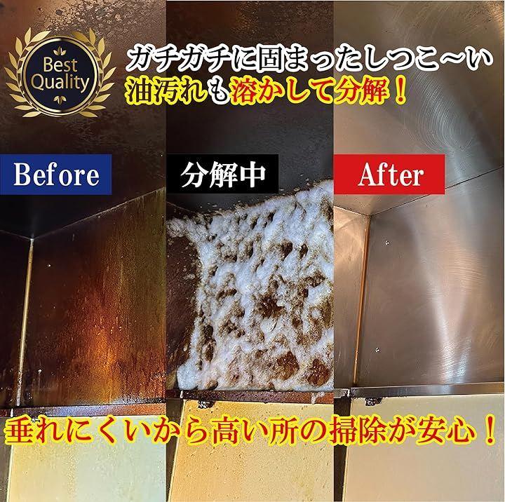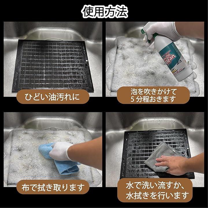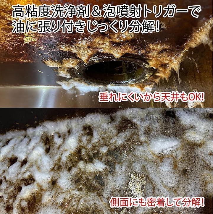 ゼロオイルクリーンが解決します。 泡タイプだから、頑固な油汚れに密着して強力分解。 高粘性で垂れないから、天井や側面にもストレスなく使えるのが特徴。 換気扇本体やファン、レンジフードや油が付きやすいキッチンの側面も。 500mlのたっぷりタイプだから、量を気にせず使える。 コンロや電子レンジ(内部)、キッチンまわりの低い位置の汚れにはもちろんご利用いただけますが 従来品だと液が垂れたり、肌に触れて炎症を起こしてしまう可能性がある天井や側面の掃除の際に本品の実力が発揮されます。