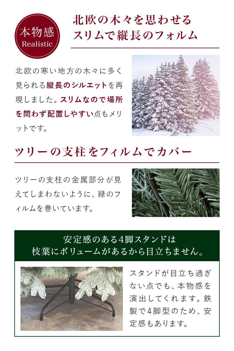 ※上記の最大横幅は、小枝を広げることによって実際は10cm前後横幅が短くなる場合があります。※組立作業時間はあくまでも平均的な時間です。個人差がかなりございますのでご了承願います。写真のイメージと実物とは色合いなど、多少異なることがあります。屋外で立てる場合は必ず丈夫な針金か、ワイヤーなどで転倒しないように固定してください。小枝の取れが若干発生する場合がございます。ツリーの構造上やむをえない現象ですので、ご了承願います。枝を広げたり、整えたりするときは必ず軍手などをして作業をしてください。