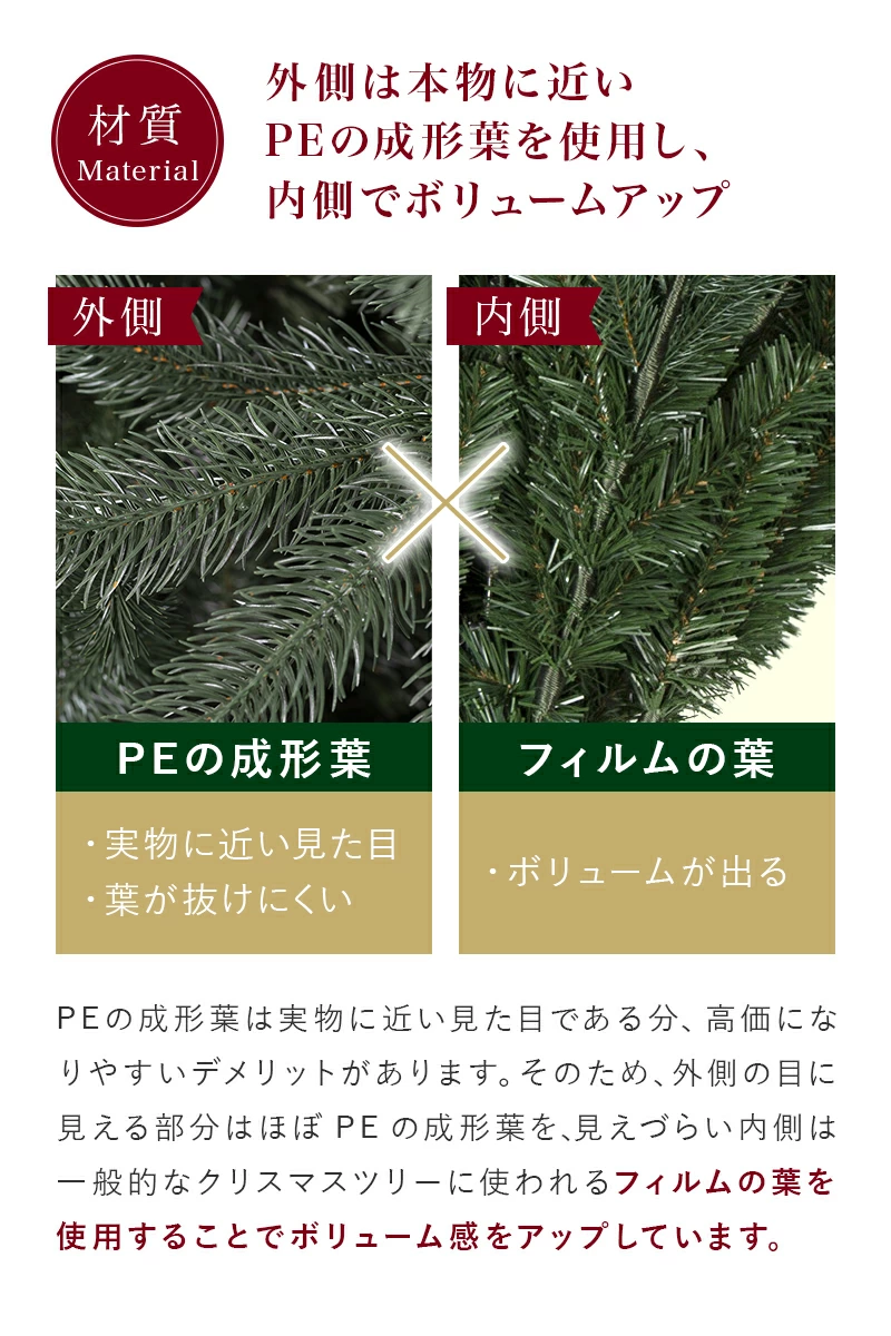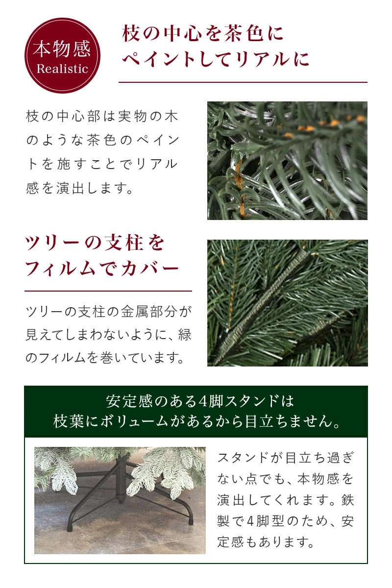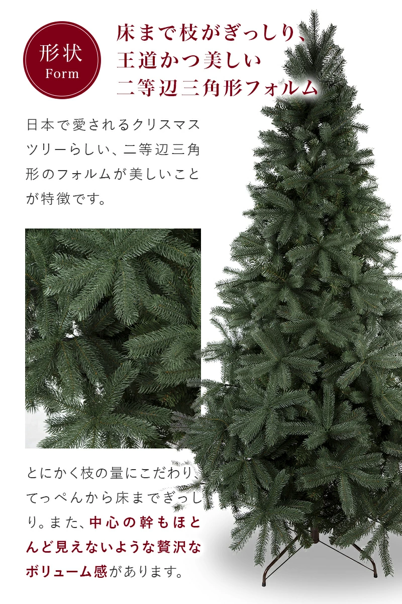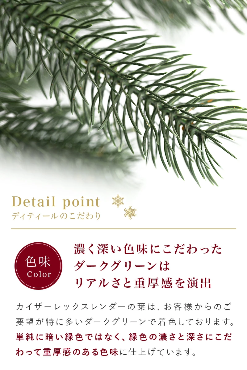 ☆セミスリムの最高峰。床までぎっしりの枝近ごろ、本物のように見えるという理由から、ポリ成型葉のツリーをお求めになるお客様が急増しています。そこで、こんなツリーをご用意しました。カイザーレックスレンダーツリーです。見える部分をほとんどポリ成型葉で構成したとても贅沢なツリーです。ツリーの内側に、ボリューミーなフィルム葉を使用して中心の幹をできるだけ見えないようにし、外側のポリ成型葉は、たくさん枝をつける努力をしています。これだけの枝の量、手の込み具合はもう、セミスリムの頂点と言っても過言ではないでしょう。葉の色は、これまた常にご要望の多いダークグリーンで全体を統一しています。最近ではこのツリーが高級感があり、オーナメント映えすることから、高級車を取り扱う自動車ディーラーなども採用していただいています。