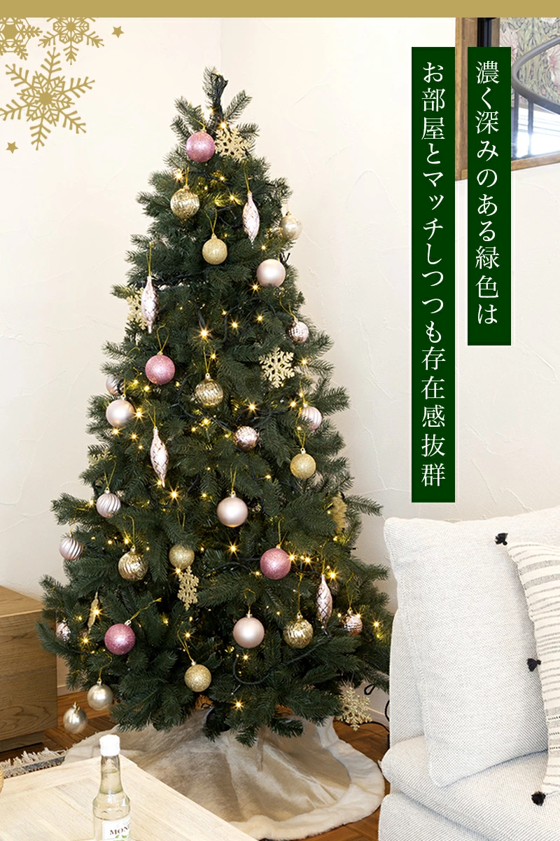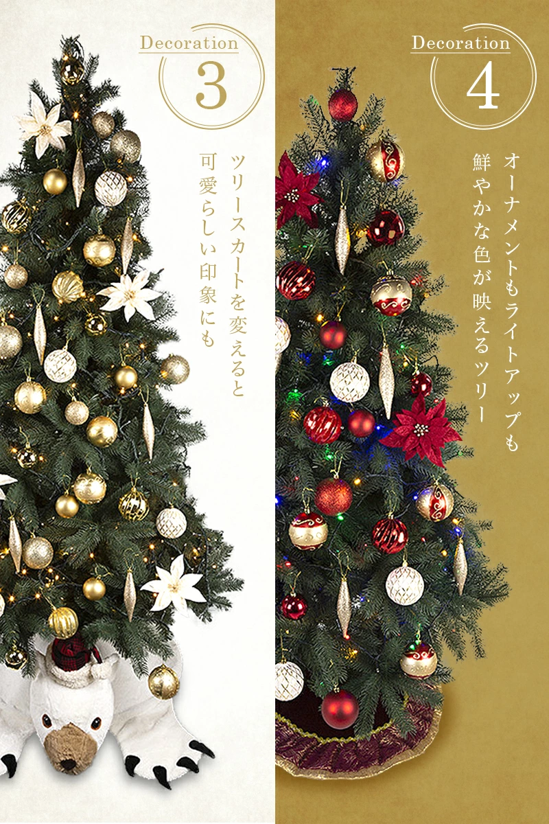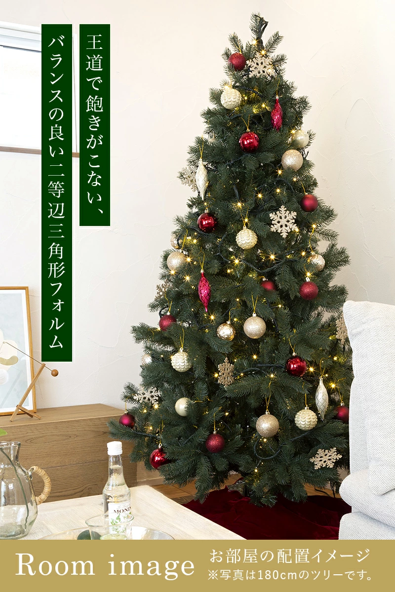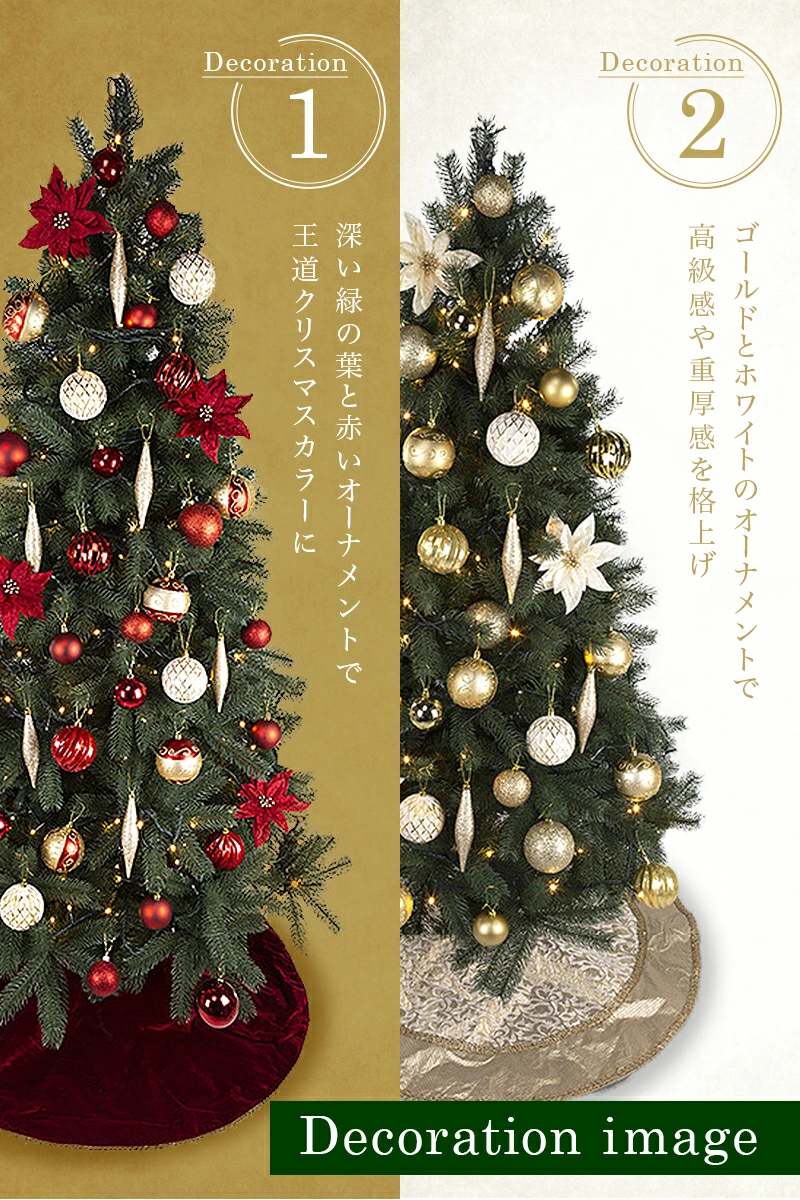 ☆セミスリムの最高峰。床までぎっしりの枝近ごろ、本物のように見えるという理由から、ポリ成型葉のツリーをお求めになるお客様が急増しています。そこで、こんなツリーをご用意しました。カイザーレックスレンダーツリーです。見える部分をほとんどポリ成型葉で構成したとても贅沢なツリーです。ツリーの内側に、ボリューミーなフィルム葉を使用して中心の幹をできるだけ見えないようにし、外側のポリ成型葉は、たくさん枝をつける努力をしています。これだけの枝の量、手の込み具合はもう、セミスリムの頂点と言っても過言ではないでしょう。葉の色は、これまた常にご要望の多いダークグリーンで全体を統一しています。最近ではこのツリーが高級感があり、オーナメント映えすることから、高級車を取り扱う自動車ディーラーなども採用していただいています。