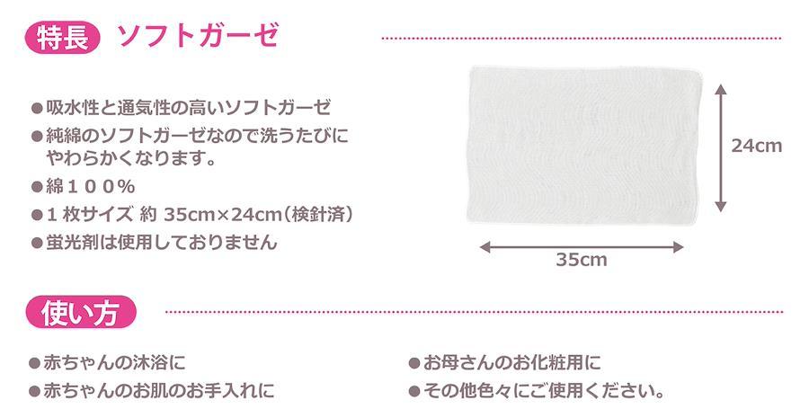 【特長】吸水性と通気性の高いソフトガーゼです。純綿のソフトガーゼなので洗うたびにやわらかくなります。1枚サイズ 約 35cm×24cm(検針済)で使いやすい大きさです。蛍光剤は使用しておりません。