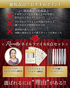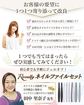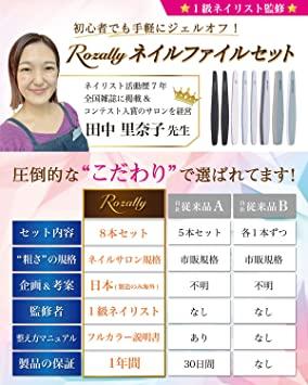 【ネイリスト監修】 自宅での ネイルケア のためにネイリストの先生にアドバイスをもらいながら少しでも使いやすいようにと考えながら設計&開発を進めました。 ジェルオフ ~ 爪磨き に必要な”エメリーボード”,”スポンジファイル”,”バッファー”などを「これ1つで全部揃う」をモットーにセットとして”爪磨きセット”として商品化をさせて頂きました。”つめやすり”や”つめみがき”など 自爪用 にフォーカスしたそれぞれの用途や注意点もネイリストの先生が監修した説明書で解説されています!【こだわり】 様々なメーカーから” ネイルファイル ”や” ネイルケアセット ”として販売されています。 Rozallyの ネイルファイルセット は国内や国外で流通している様々なサンプルを取り寄せ、”使いやすさ”や”削る粒度”にこだわりを持って製造しました。初心者の方でも届いた日に