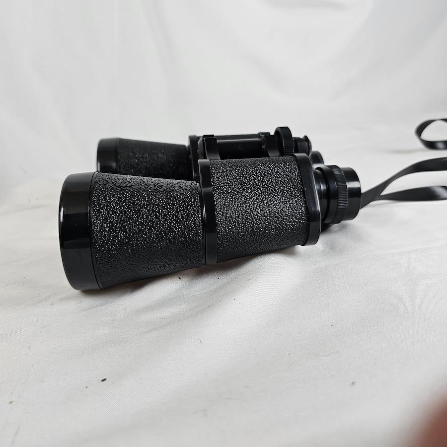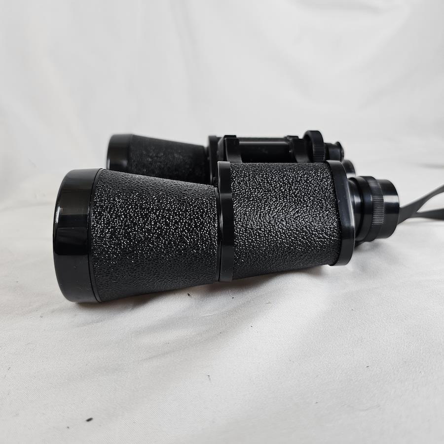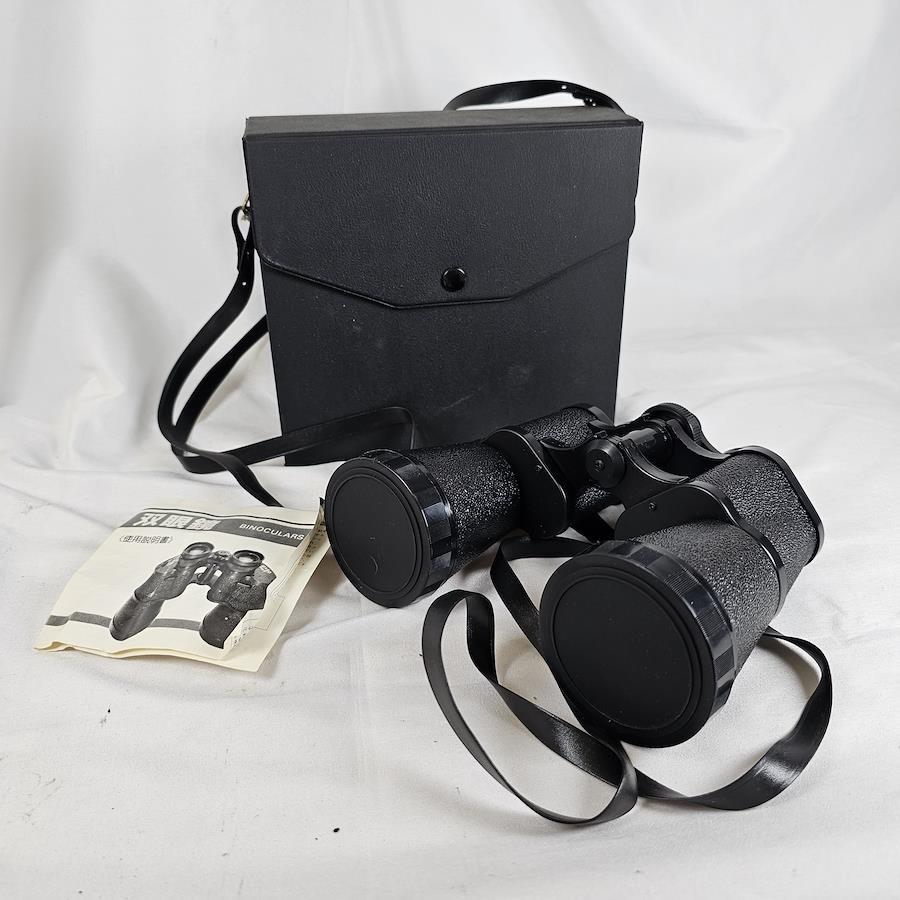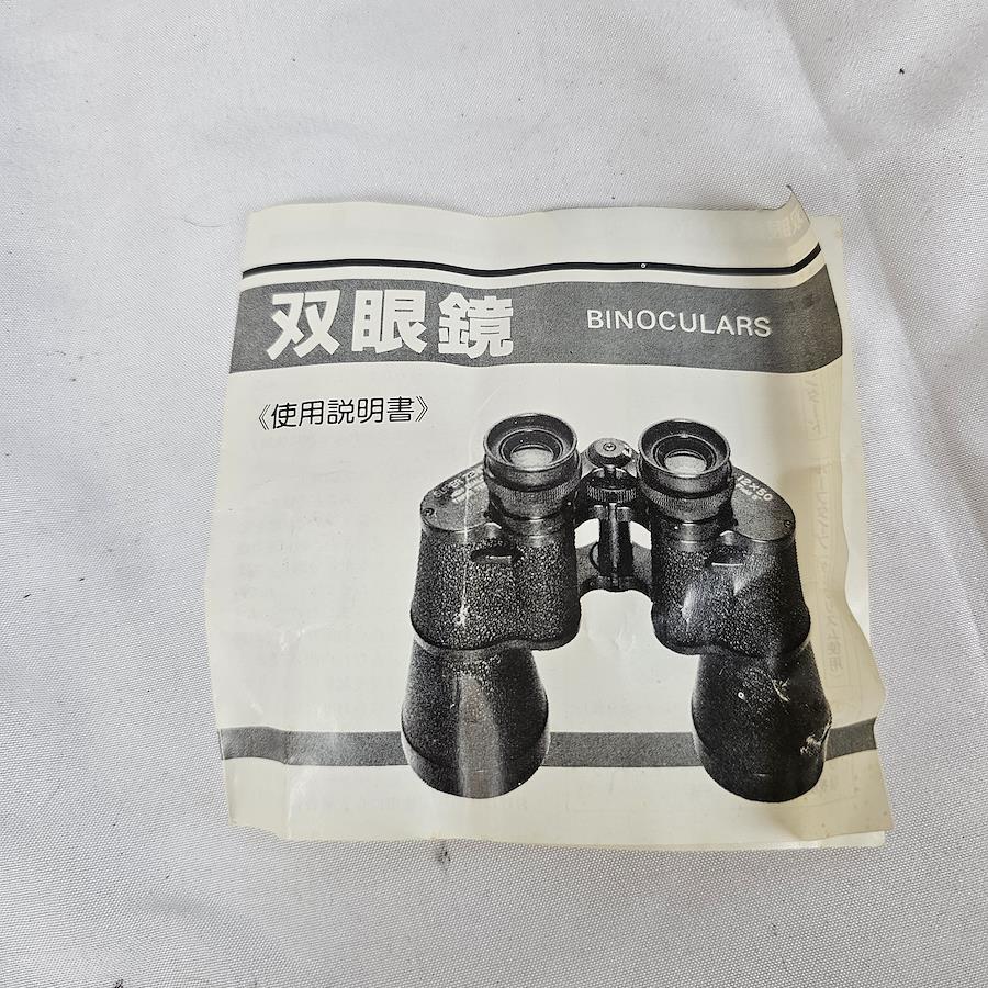 ラバーコーティングの滑り止めデザインの双眼鏡、ケースと取扱説明書付き。