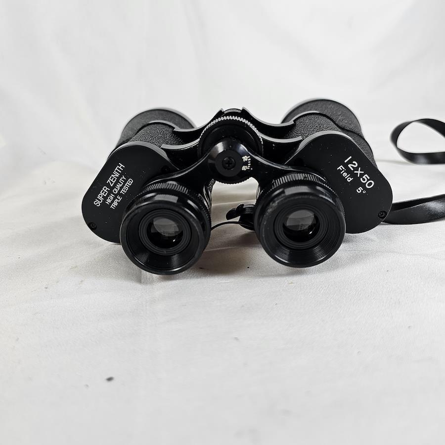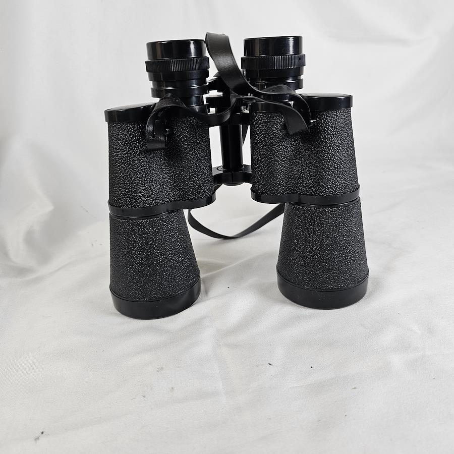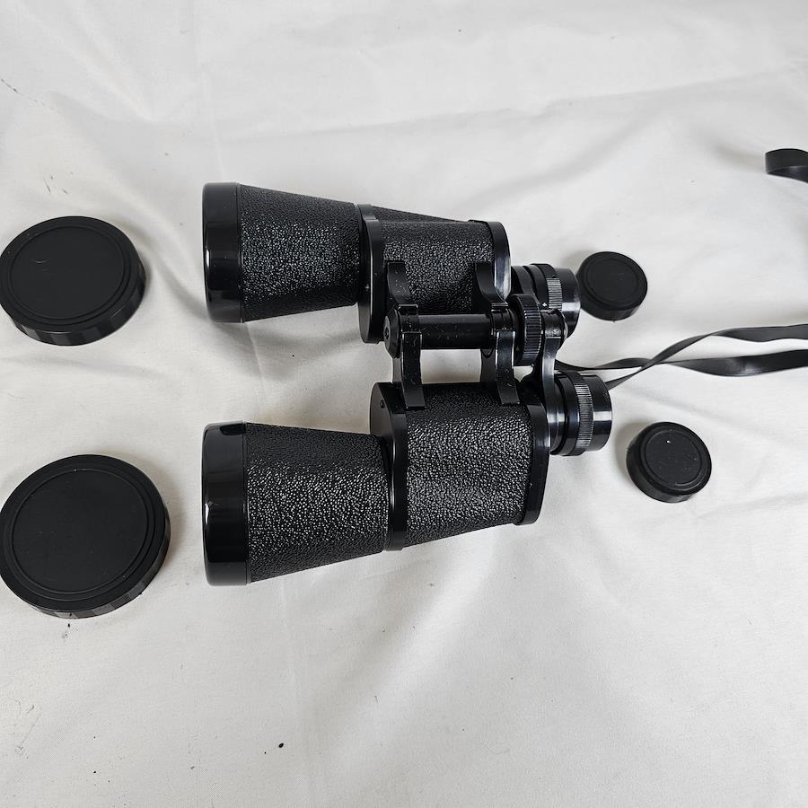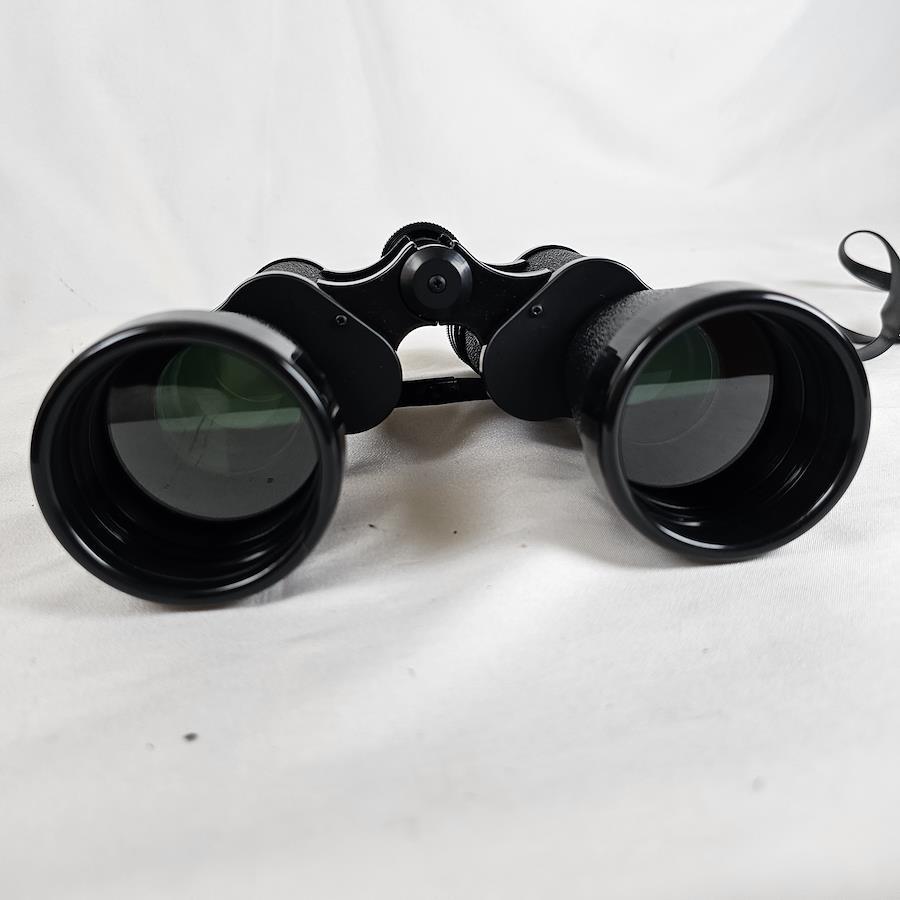 ラバーコーティングの滑り止めデザインの双眼鏡、ケースと取扱説明書付き。