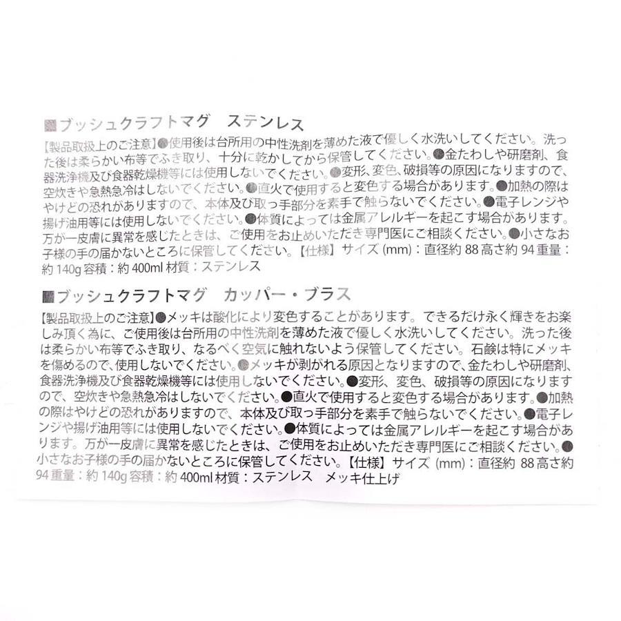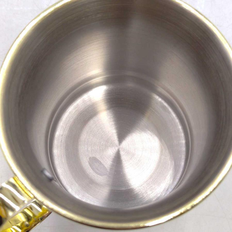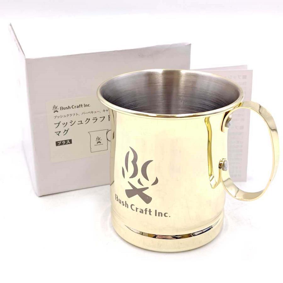 [ブランド] ブッシュクラフト Bush Craft[タイプ] マグ ブラス[重量] 約140g[サイズ] 直径約88mm、高さ約94mm、容量約400ml[材質] ステンレス メッキ仕上げ[状態] 未使用品
