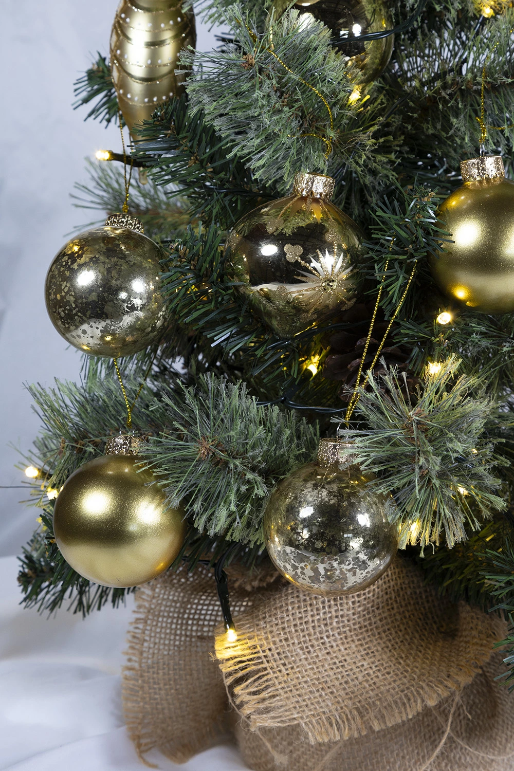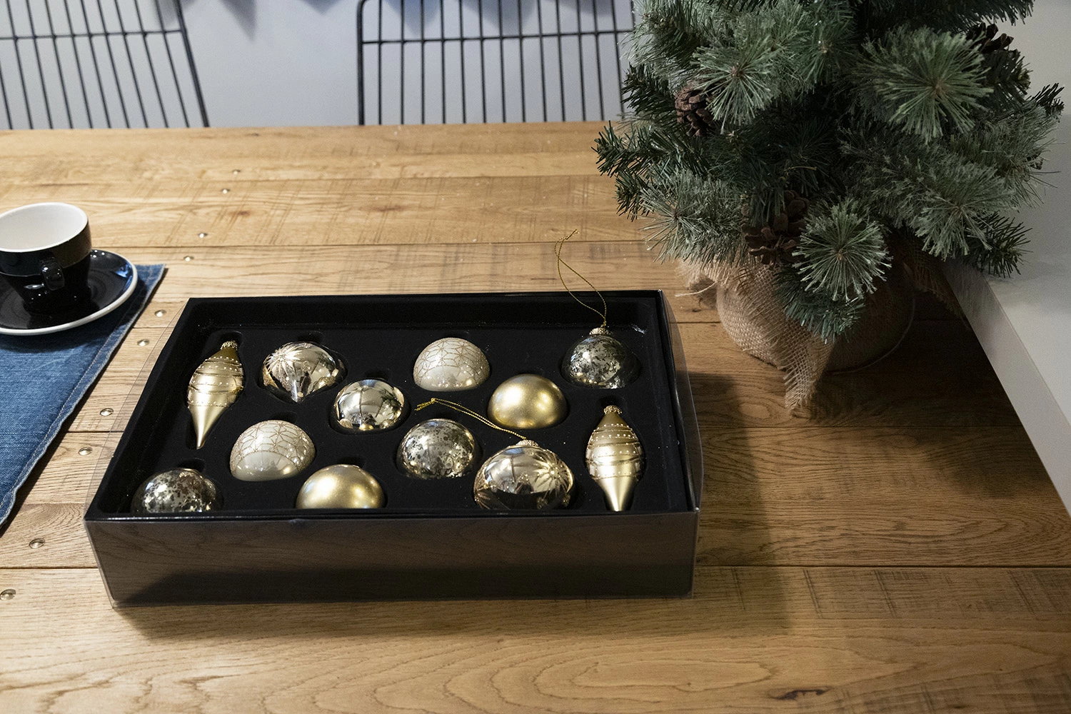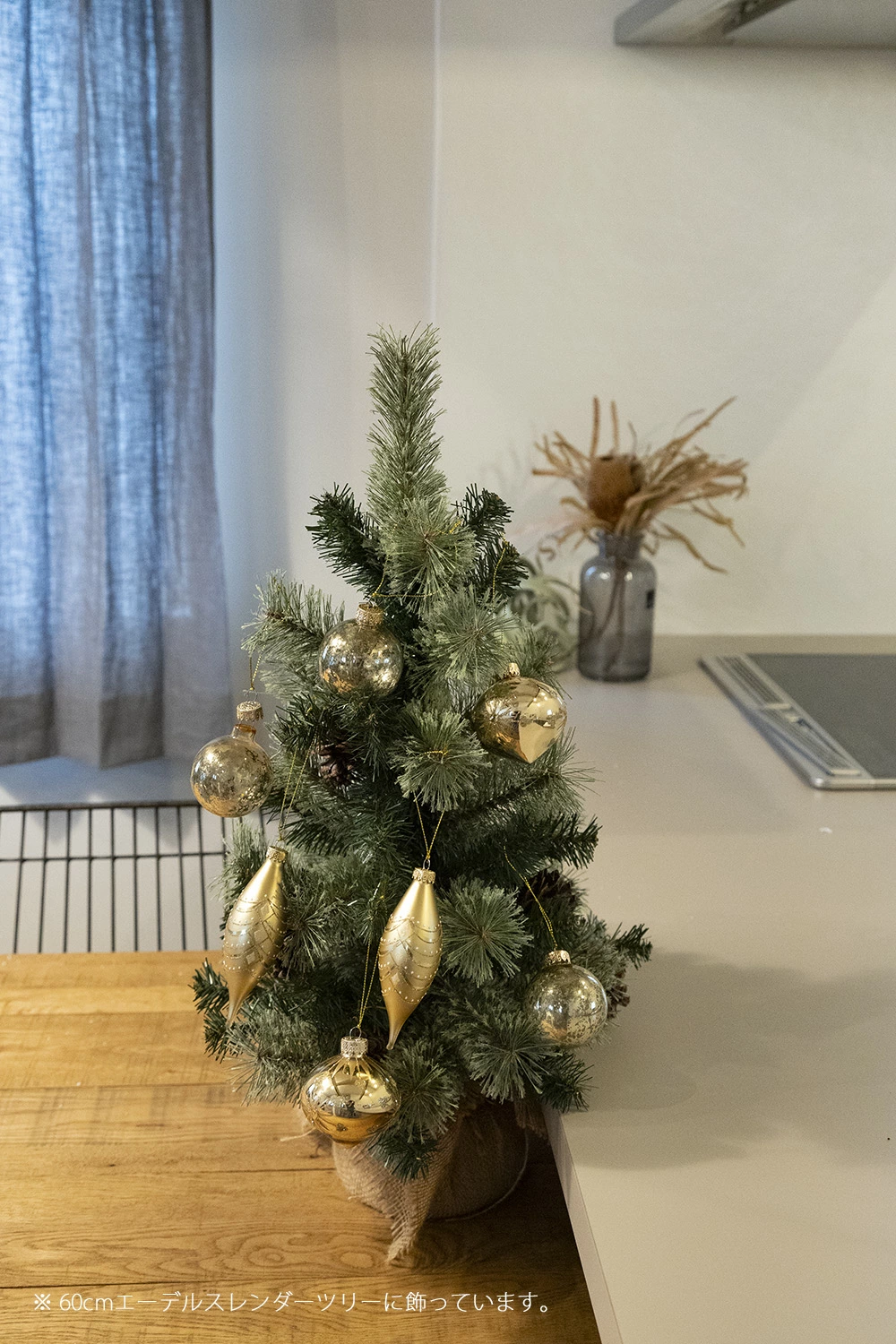 グラスボールオーナメンントセット(カームゴールド)☆綺麗なフォルムとデザイン細長いツララ型、水をモチーフにしたドロップ型、そして綺麗なデザインを施したボール型。それらすべて本物のガラスで作られています。グラスボールの良さは、プラスチック製に比べ、そこはかとない上品さがあります。そこはかとない。つまり、何となくとしか言い表せないのがもどかしいのですが、要は質感でしょうか。写真では伝わりにくいのが残念です。