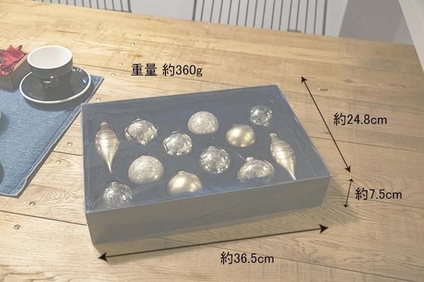 ☆パッケージの大きさ横幅:約36.5cm縦幅:約24.8cm高さ:約7.5cm重量:約360g/箱材質:ガラス・その他吊り下げ用ひも付12個箱入り(5種類)