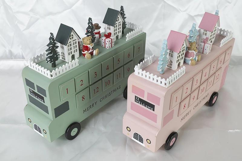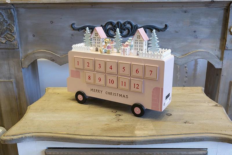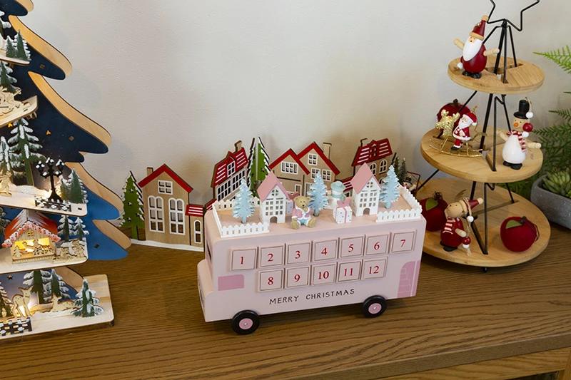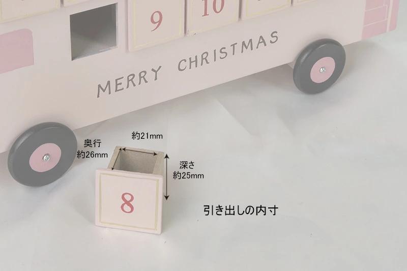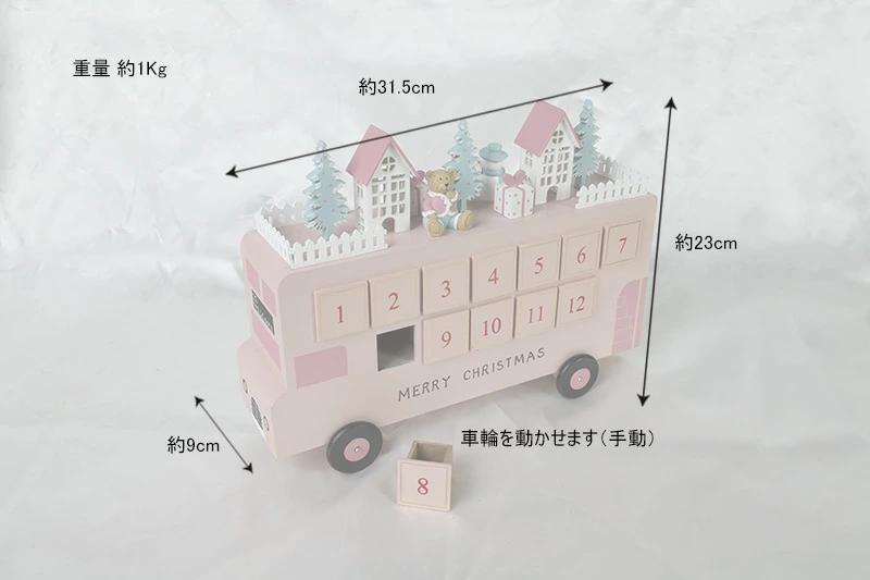 アドベントカレンダー(ファンシーバス)デザートピンク☆ポップなデザインで楽しい思い出を!バスの屋根にかわいいベアーやスノーマンをデコレートしためちゃくちゃ可愛いアドベントカレンダーです。手押しですがタイヤも動かせるんですよ(笑)このアドベントカレンダーですでクリスマスの楽しい思い出がまたひとつ増えそうですね。バス自体はシンプルでポップなデザイン。お色はお子様も大好き、お菓子のような(デザートピンク)です。