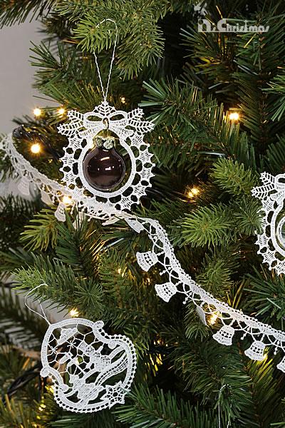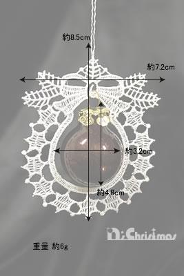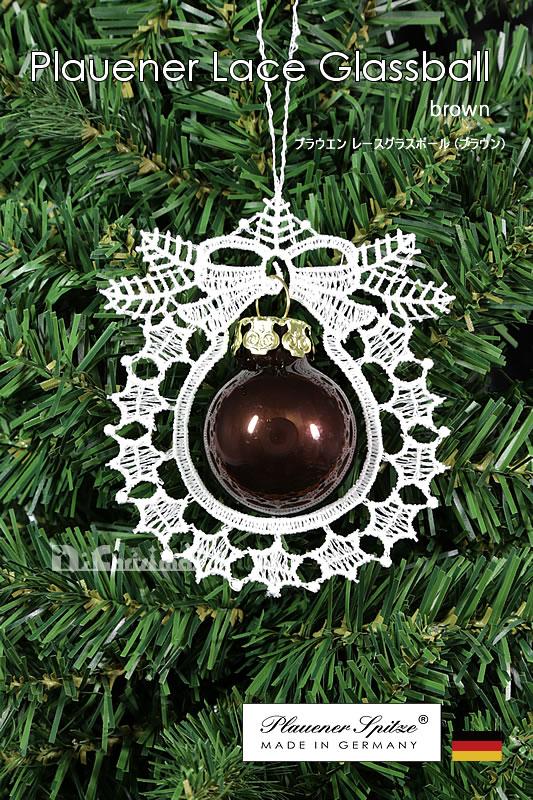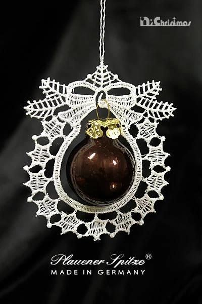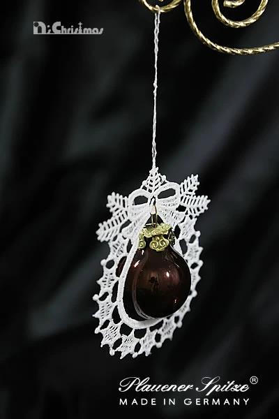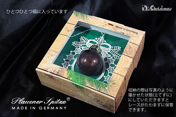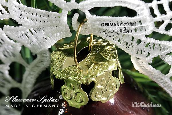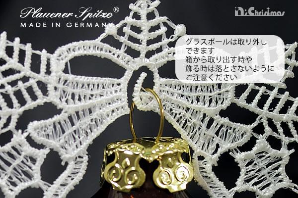 ドイツが世界に誇る高級レースブランド「プラウエンレース」を使用したクリスマスオーナメントです。基本のレースオーナメントにグラスボールを組み合わせたとても綺麗なオーナメントです。精緻なレースもさることながら、ボールの吊るす金属部分にはGERMANYの刻印があり、自信と誇りを感じます。また、とても可愛いBOXに入っているのも素敵です。ボールを吊るすフックまでもがレースでできていますので、ボールが落下しないよう丁寧な取り扱いをお願いします。