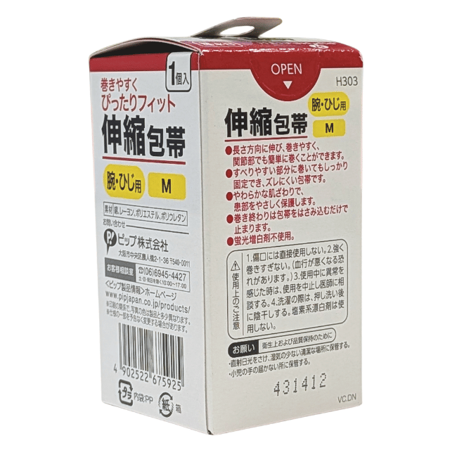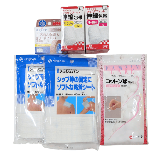 [内容]・ピップ 伸縮包帯 腕・ひじ用 Mサイズ・ピップ 伸縮包帯 手・指用 Sサイズ・ネクスケア キズあと保護&肌にやさしい不織布テープ・ニチバン シップ等の湖底にソフトな粘着シート×2個・白十字 コットン球 ピンセット付き