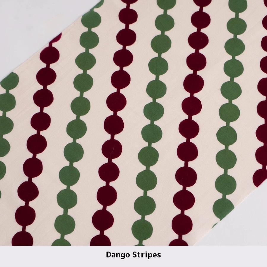 ころころとした団子の愛らしい形を、縞と丸の連続模様で表現したデザイン。