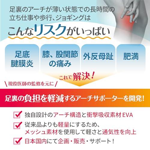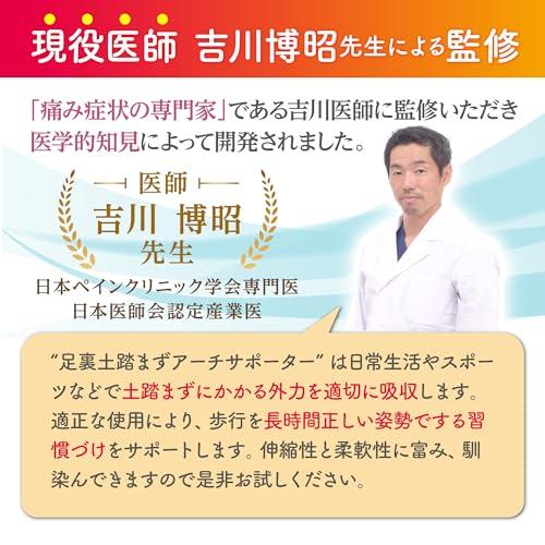 【現役医師(日本ペインクリニック学会専門医)が監修】 「痛み症状の専門家」であるペインクリニック学会専門医・吉川博昭氏による監修。長時間の立ち仕事や、歩行、ランニング時、その他スポーツ等の使用で、足の負担を感じている方たちを一人でも多く救いたい。そんな想いで生まれた足底専用アーチサポーターです。あらゆる足型の方にもフィットするように設計されています。※足サイズ(長さ、幅、足囲)によってフィット感は個人差がございます。 【専門家の声から生まれたアーチ構造と衝撃吸収素材EVA】 一般的なサポート設計には見られないアーチ構造と、衝撃吸収素材EVAを使用する事であらゆる足型の方にもフィットさせる事に成功。フィットさせながらも首部分を安定させることが可能になっています。 足底・足首をサポートし、歩きながらでも装着している事を忘れるほどの自然な使用感を体験いただく事が出来ます。 【こだわったのは軽さと通気性】 商品が頑丈であっても、重くてつけ心地の悪いものでは、長時間の装着が困難です。そこで当商品がこだわったのが、「軽さ」と「通気性」。従来品よりも、1gでも軽量化を行う事、そして通気性を両立するために、高品質のナイロン素材を使用して軽さと通気性を向上させています。 薄型のため、靴下装着時でも自然にフィットし、靴を履いて違和感なく歩くことが出来ます。 【取り付け簡単】 素足に直接装着するとも違和感なく行えます。ヨガやジョギング時、その他のスポーツ時でも装着することが可能です。靴下やストッキングを履いた状態でも使用可能です。 【日本で検品サポート】 当商品は日本ブランドです。開発、検品、発売、サポートまで一貫して行っております。製造は実績ある国外工場と契約し行っております。 【365日保証付き】 お買い上げから365日の品質保証をお付けしております。万が一、注文後にサイズ違い、歩行中の破れなどありましたら無償でお取替えさせていただきます。