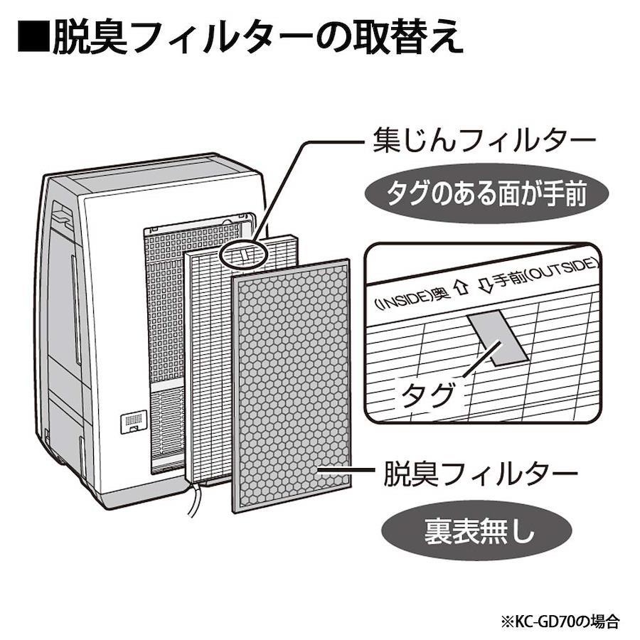 対応機種:KC-GD70、KC-HD70交換目安:約10年交換の目安説明:一般家庭で1日にタバコを5本吸った場合。日本電機工業会規格(JEM1467)に基づき算出。ご使用状況やニオイの種類・強さによっては交換時期が早くなることがあります。