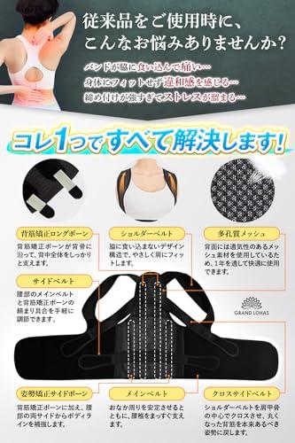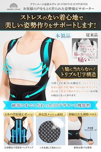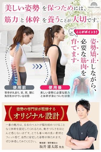 ?【キャリア15年以上の理学療法士監修】姿勢の専門家としてメディアにも出演経験のある坂井雄太郎先生が監修する姿勢サポーターです。猫背や巻き肩、反り腰などに直接アプローチし、美しい姿勢作りをサポートします。 ?【脇が痛くならないオリジナル設計】脇にバンドを通さないトリプルU字構造により、従来品の欠点を解消しました。強引な締め付けによる一時的な姿勢維持ではなく、着用しながら綺麗な姿勢に必要な筋肉と体幹を育てるよう設計されたGRAND LOHAS独自の商品です。 ?【自然な着心地とフィット感】「バンドが脇に食い込んで痛い…」「締め付けが強すぎてストレス…」といった他社製品と異なり、人間工学に基づいた3Dデザインでストレスフリーな着心地を実現!初めは10~20分からスタートし、慣れてきたら1日2時間を目安に着用する習慣をつけていきましょう。 ?【男女兼用で大人から子供まで着用可能 】S,M,Lの3つのサイズからお選びいただけます。左右6本のベルトで締まり具合を調整できるため、どんな体型の方にもフィットします。※背面にプレートを内蔵しておりますので、洗濯機洗いはお控えください。 ?【日本人スタッフによる安心サポート】GRAND LOHASの姿勢サポーターは、30日間のメーカー保証がついております。商品の品質には万全を期しておりますが、万が一商品の不具合があった場合は、交換・返品・返金など迅速に対応させていただきます。