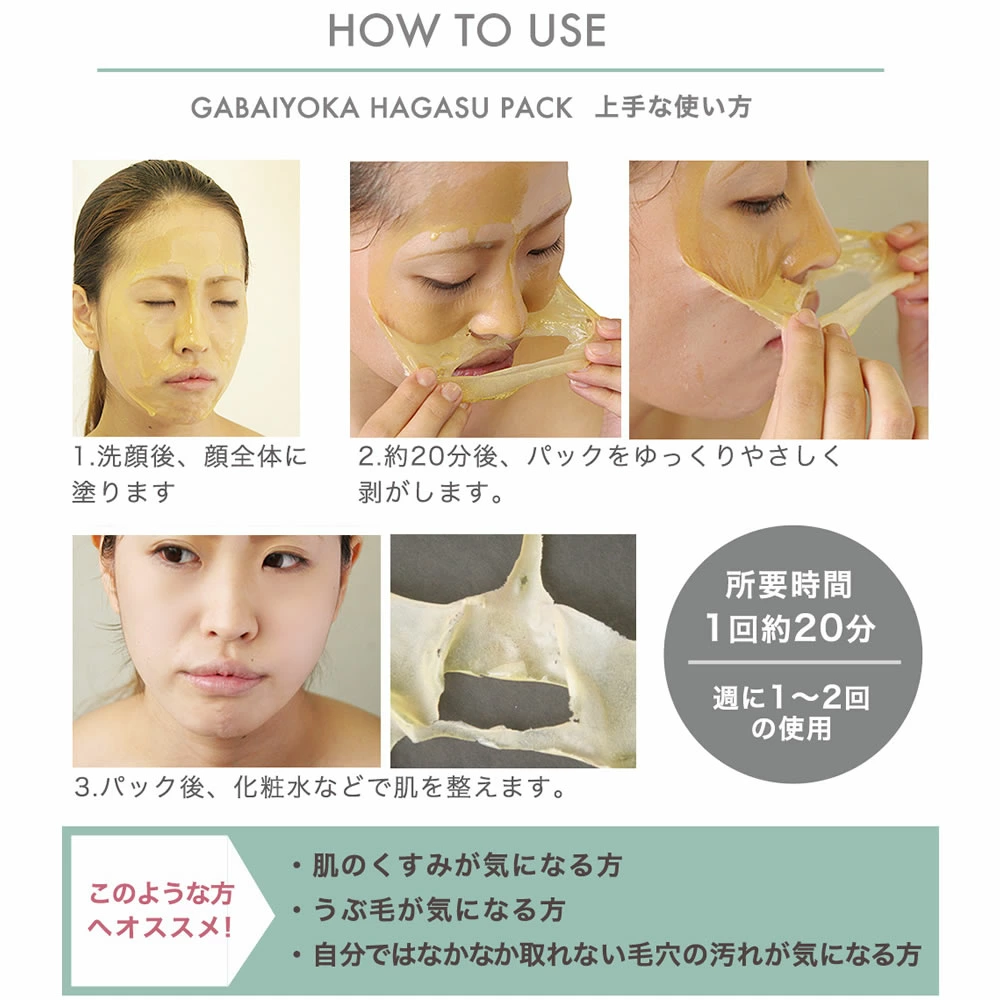 【使用方法】週に1回、洗顔後に使用します。1回の使用量(約500円玉×2枚分)を手に取り、顔全体にムラが出ないように塗布します。約20分後、パックが完全に乾いてきたらゆっくり端から剥がしていきます。(パックのまわりから中心に向かって少しづつゆっくり剥がします。)パック後、化粧水・乳液などで肌を整えます。