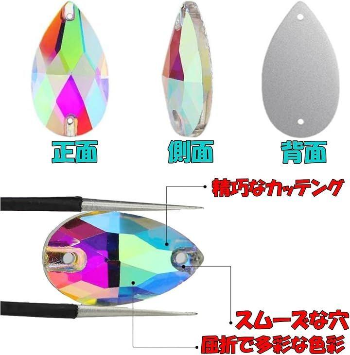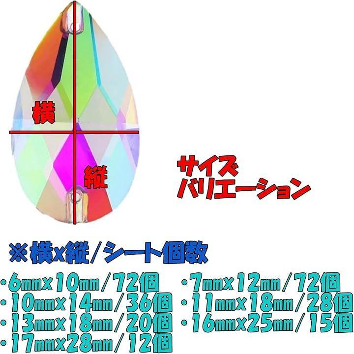 「素材」ガラス「色」AB彩、オーロラ 「タイプ」ソーオン、縫い付け用両端穴2つ「形状」しずく型 「販売単位」各サイズ別トレー1つで販売(トレー内の個数はサイズ別)