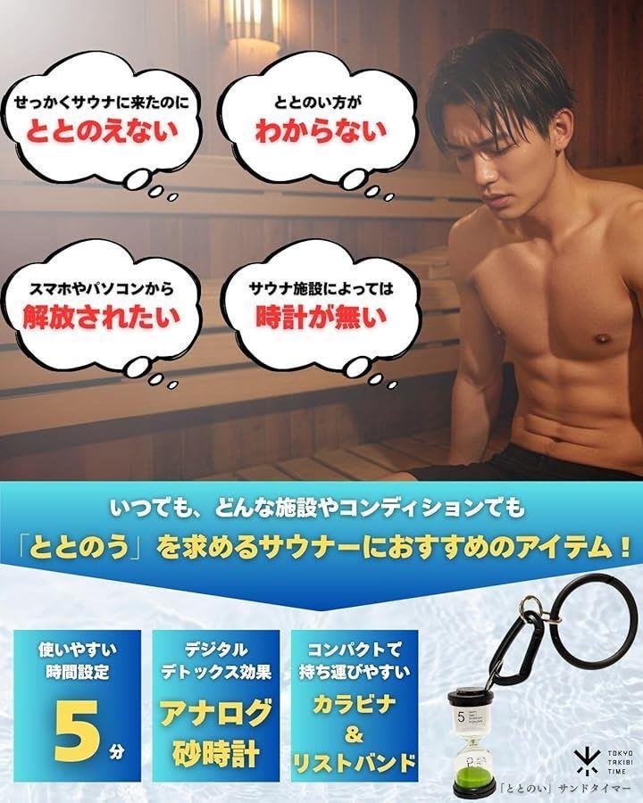 「こんなサウナの悩みありませんか?」 「せっかくサウナに来たのにととのえない…」「ととのい方がわからない…」 「スマホやパソコンから解放されたい…」「サウナ室に時計がない…」「目が悪くて時計が見えない…」そんなお悩みをととのいサンドタイマーが解決します。