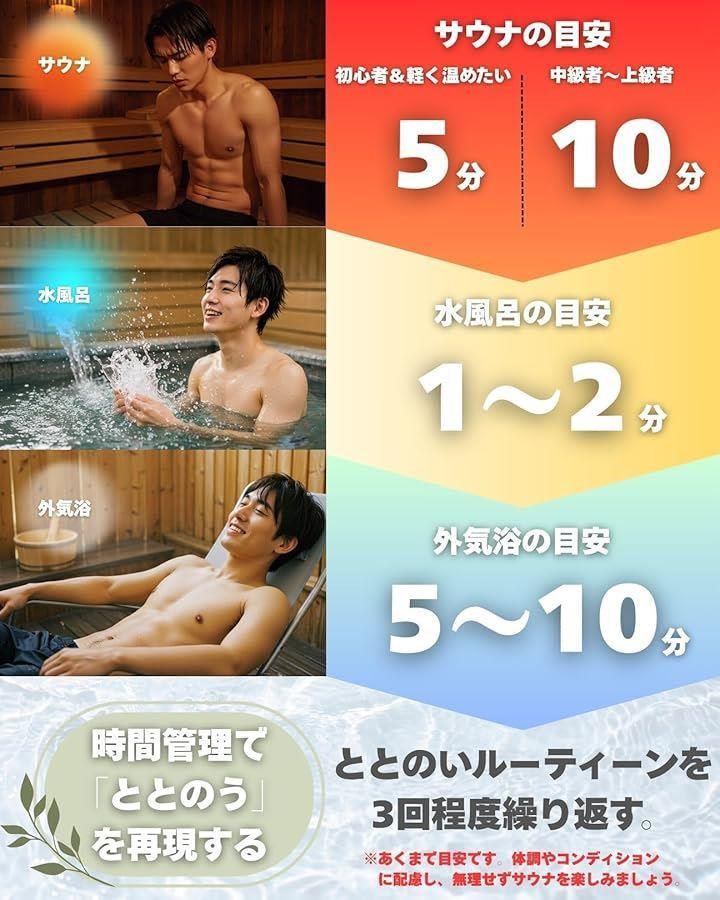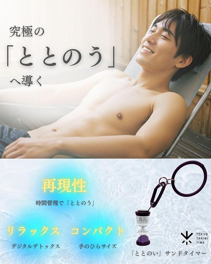 「時間管理で「ととのう」を再現する」ととのうを再現するために時間管理は重要です。サウナ>水風呂>外気浴のルーティーンを制することで、いつでもどんな施設でもととのうを再現できるようになります。ととのいサンドタイマーは「ととのう」を再現するために最適なアイテムです。