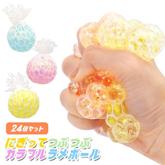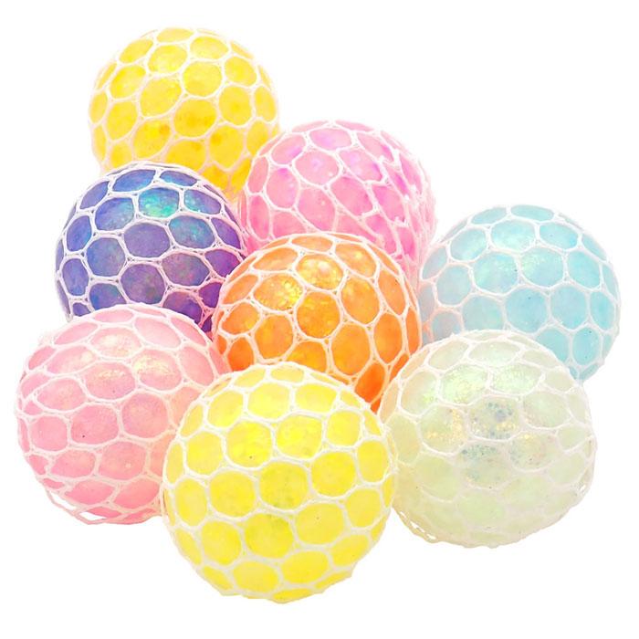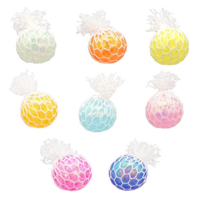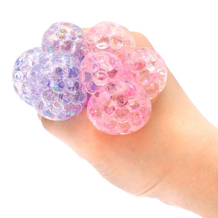 むぎゅっと握ると、網目の間から柔らかいボールが飛び出します!