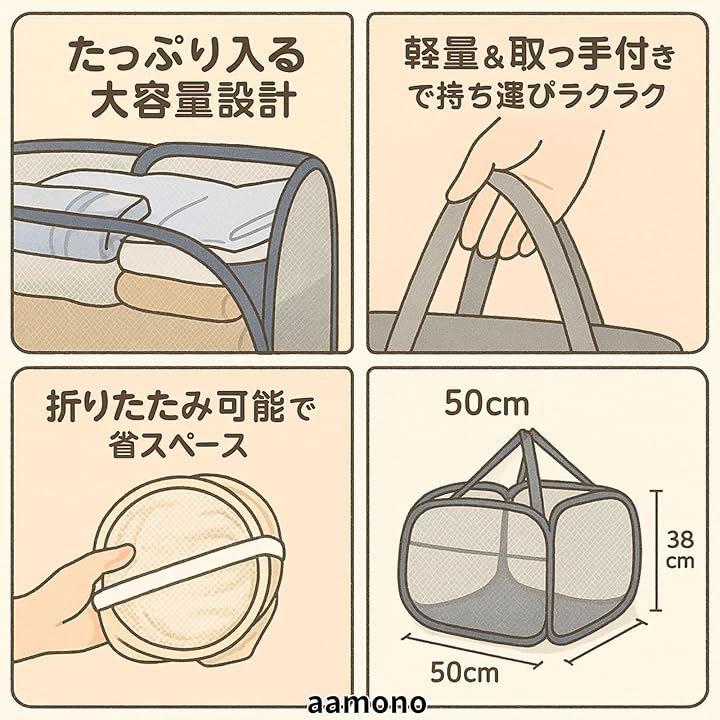 サイズ(広げた場合):幅50x奥行50x高さ38cm/素材:ナイロンメッシュ・鉄線ワイヤー/カラー:ベージュ