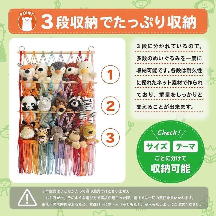 「3段収納でたっぷり収納」このぬいぐるみ収納ハンモックは3段に分かれており、多数のぬいぐるみを一度に収納可能です。